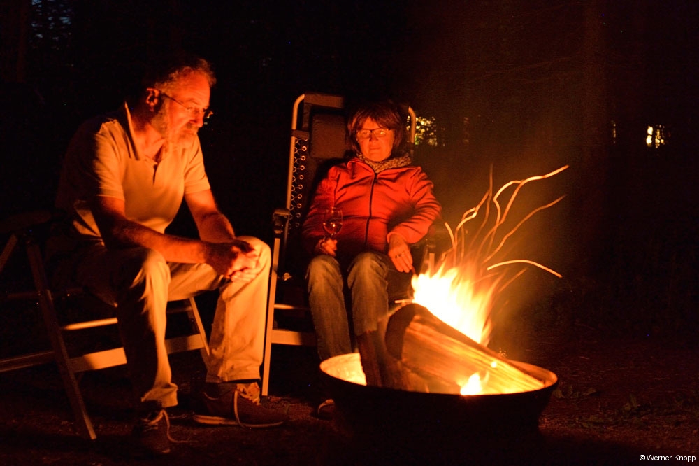 Am Abend saßen wir noch bis spät in die Nacht herein am Lagerfeuer auf dem Campingplatz im Wald und genossen das freie Leben in Kanada.