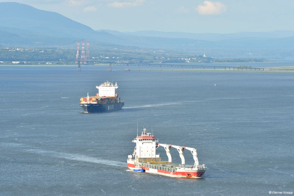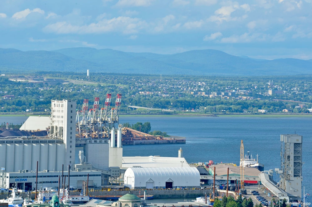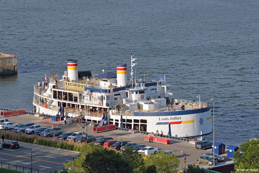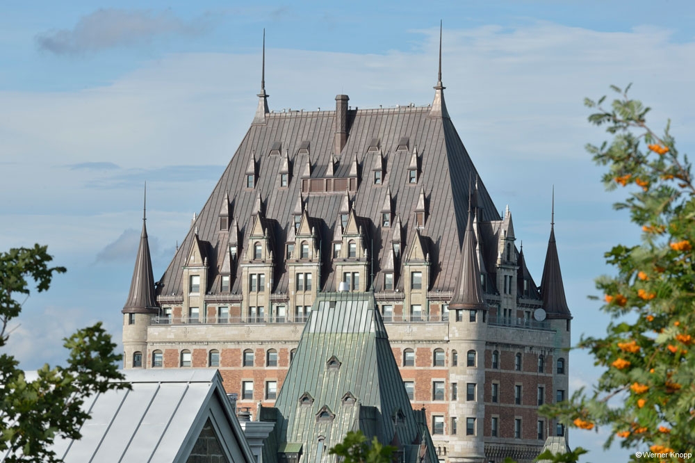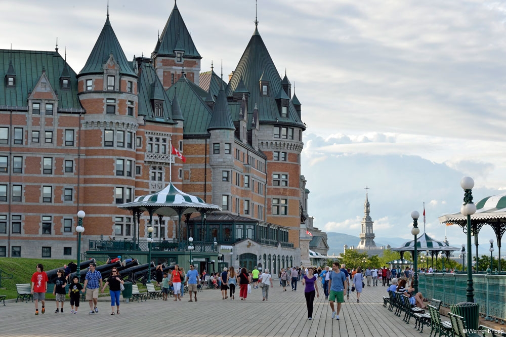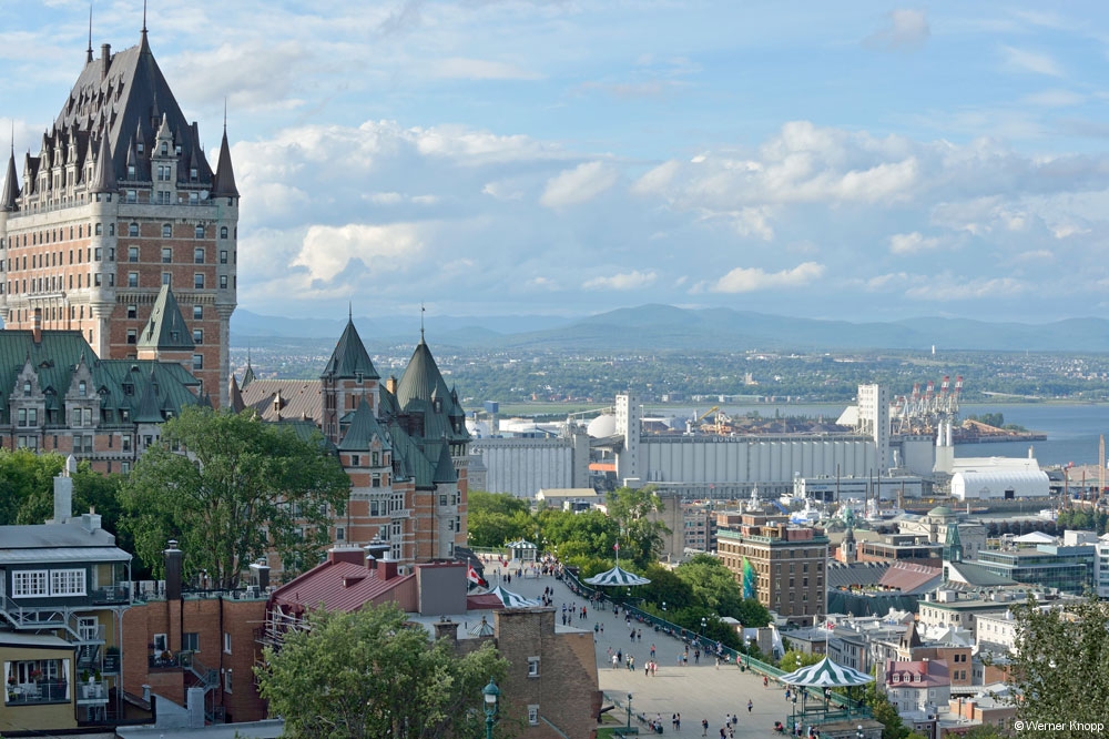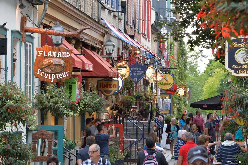 Québec ist einen Besuch wert! Wie schon so oft parkten wir kostenfrei und gingen den Boulevard Champlain am Wasser entlang ins „Vieux Québec“, das sich in „Haute-Ville“ und „Basse-Ville“ aufteilt. Geschmiedete Pferde säumten den Weg. Im Quartier du Petit Champlain waren alte Steinhäuser, enge Gassen, kleine Geschäfte, Cafés und Menschen aus vielen Nationen zu sehen. Direkt zu Beginn konnte Werner wieder einige moderne Plastiken fotografieren. Wir schlenderten durch die Altstadt, stärkten uns im Restaurant und stiegen die Treppen hoch in die Oberstadt. (Auf die Benutzung der Seilbahn verzichteten wir, Bewegung ist ja wichtig.;-) ) Weiter ging es zum Château Frontenac auf die Terrasse Dufferin (aus Holzbohlen). Von dieser einen halben Kilometer langen Promenade hatten wir einen herrlichen Blick auf den St.- Lorenz-Strom. Das Wetter war wechselhaft. Direkt am Anfang traten Straßenkünstler auf, denen wir ein wenig zuschauten. Ein Mexikaner und später eine Gruppe von vier Akrobaten brachten das Publikum zum Lachen und Staunen. Während die eine Gruppe noch auftrat, machten sich die nächsten Künstler schon fertig und es ging nahtlos weiter.