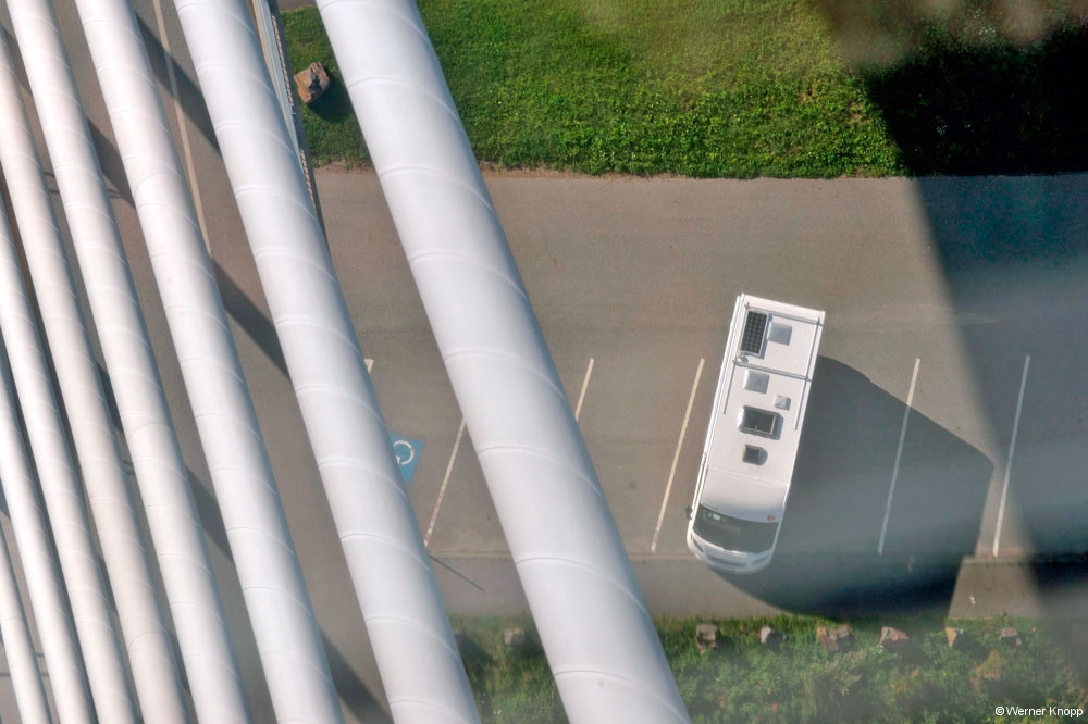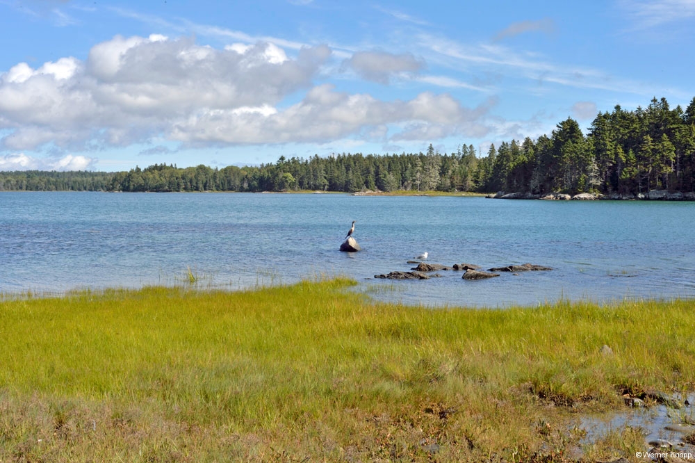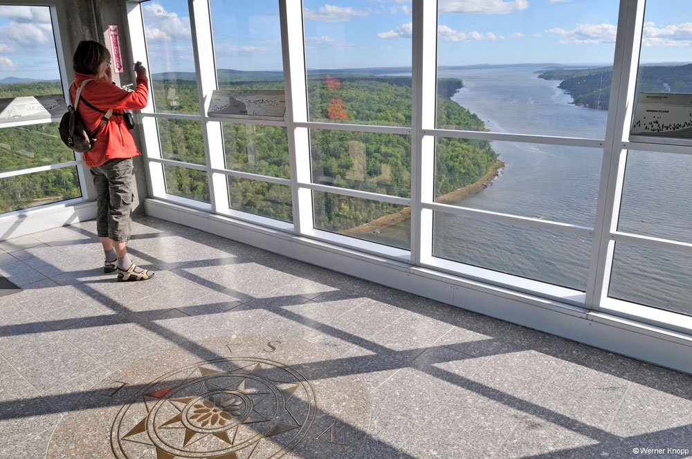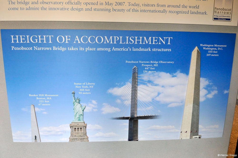 Bei strahlendem Sonnenschein war unser erster Halt „The Penobscot Narrows Bridge and Observatory“. Ein Aussichtssturm mitten auf einer Brücke! Ein Fahrstuhl brachte uns zum 447 ft. hohen Aussichtsraum und wir genossen den Rundumblick auf die Landschaft. Sogar der Cadillac Mountain war in der Ferne sehen. Das Wasser des „Penobscot River“ und des Atlantiks vermischen sich hier zu Brackwasser und mit der Kraft der Gezeiten entstehen Strudel in diesem Bereich.