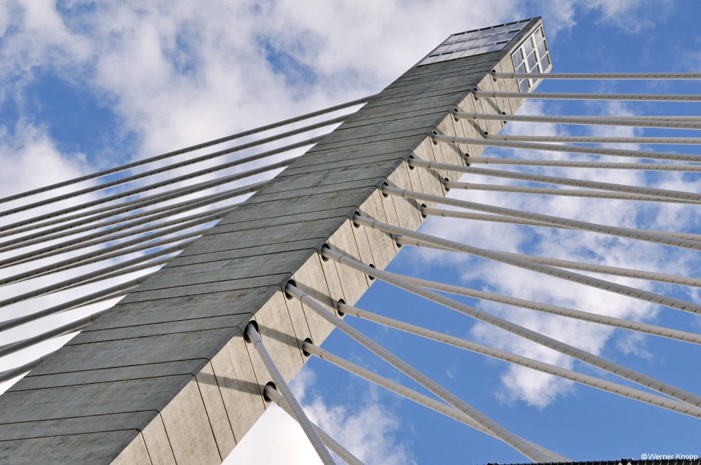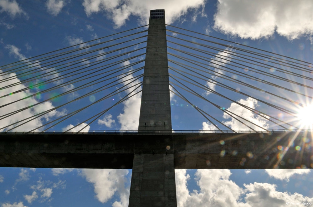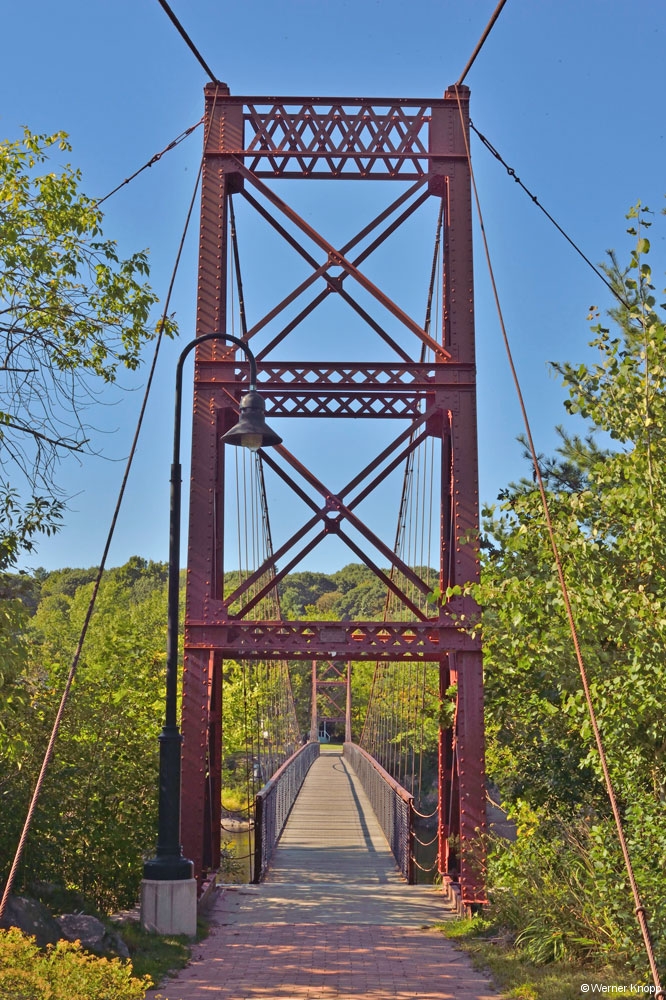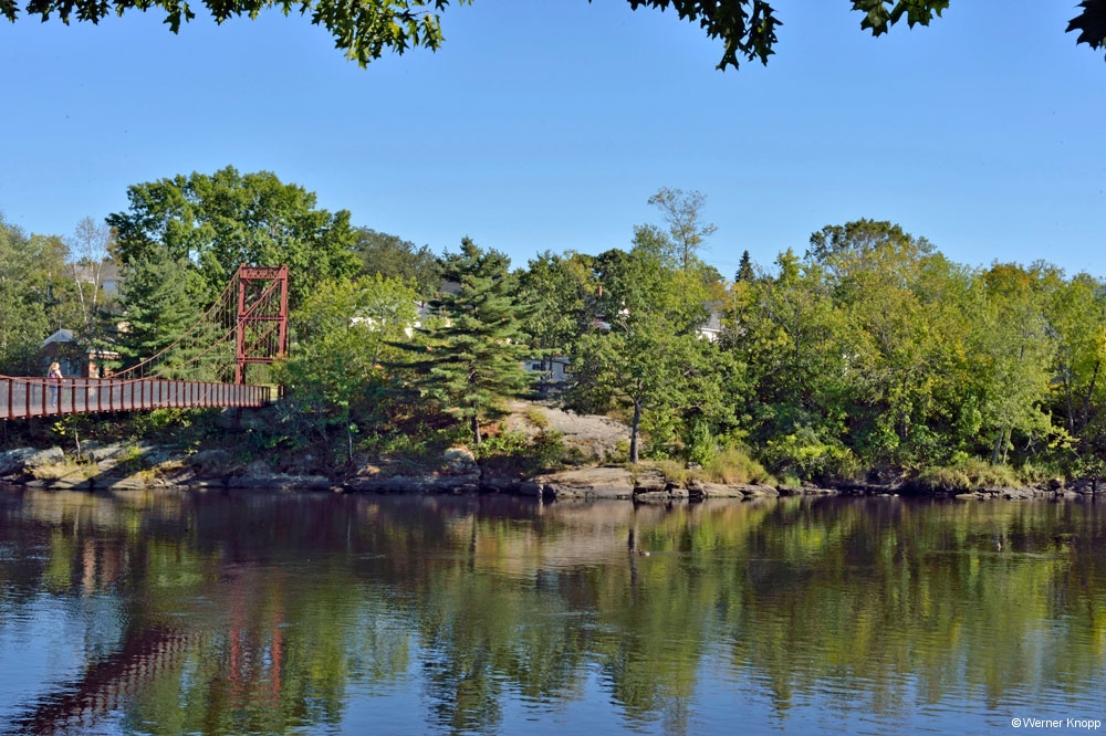Auch am nächsten Tag mussten wir noch einige Meilen zurücklegen, um unserem Ziel näher zu kommen. Bei strahlendem Sonnenschein machten wir in Brunswick an der Brücke „Androscoggin Swinging Bridge“ eine Rast mit Picknick und Spaziergang. Ein komisches Gefühl über dieser Brücke zu gehen! Auf den Felssteinen im Fluss saßen Reiher und Möwen in der Sonne. Zu gerne hätte Werner sich im Wasser abgekühlt, aber ein Verbotsschild hielt ihn davon ab, denn im Fluss bildeten sich gefährliche Strudel….