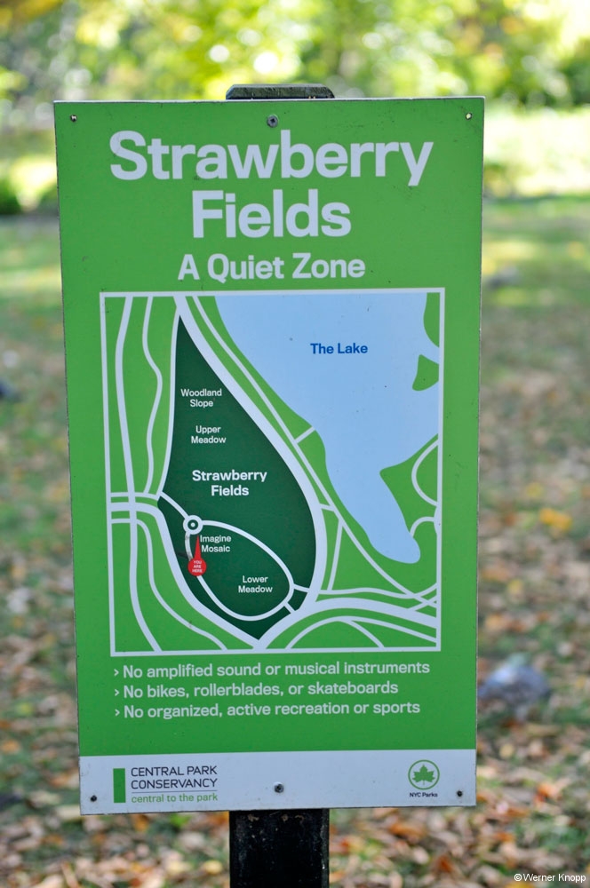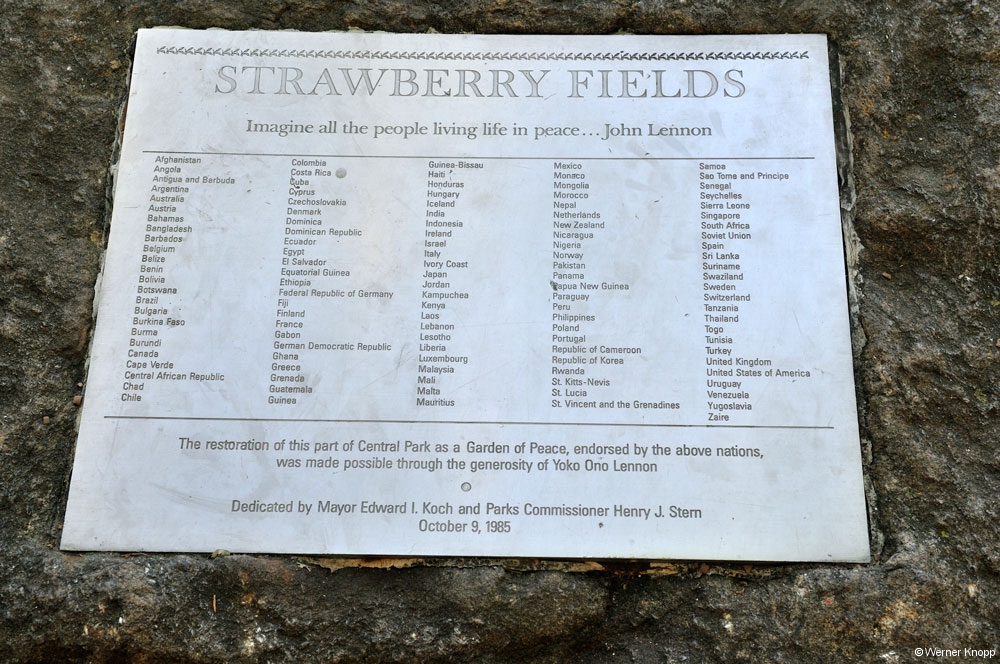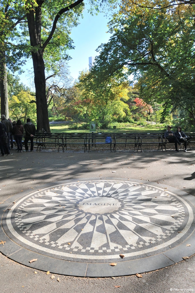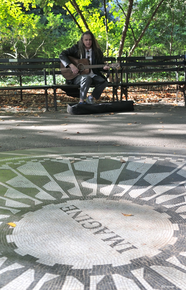 Im Central Park befindet sich die Gedenkstätte „Strawberry Fields“, die sich Werner unbedingt anschauen wollte. Wir mussten ein wenig suchen, fanden sie schließlich und blieben recht lange dort. Die Gedenkstätte wurde von Yoko Ono gestaltet und John Lennon gewidmet. In einem Mosaik aus schwarzen und weißen Steinen steht „IMAGINE“. Wer kennt es nicht, dieses Lied? Ein Gitarrist spielte Lieder der Beatles, das ging unter die Haut!