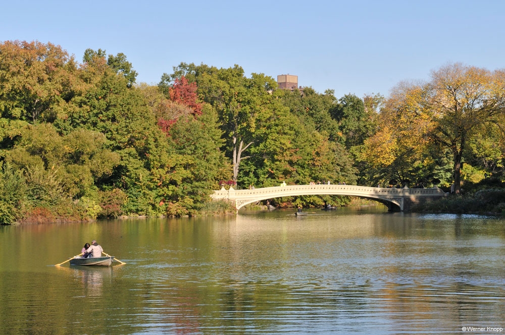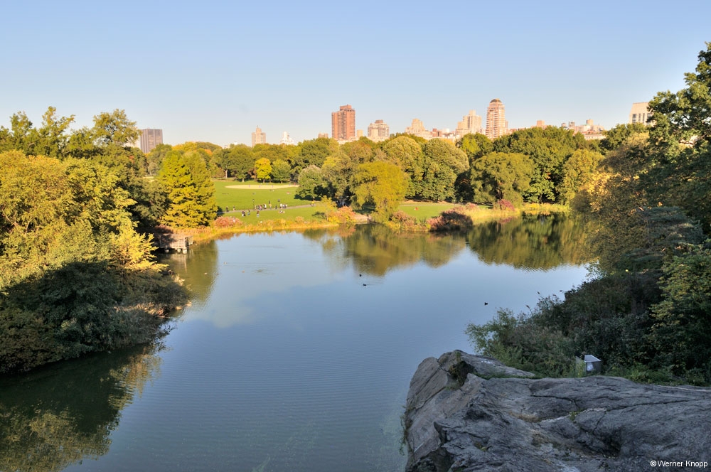Nachdem wir die angebotenen Fahrrad- und Kutschtouren abgelehnt hatten, betraten wir den Park und wenig später trat Ruhe ein. Die Hektik und der Lärm der Stadt lagen hinter uns. Jetzt galt es eine Bank in der Sonne zu ergattern und unser kleines Picknick zu genießen. Herrlich! Große Granitblöcke erinnerten uns an Cape Ann, damit hatten wir hier nicht gerechnet. Großzügige Grünflächen zum Picknicken, für Spiel und Sport, Spazierwege, Fahrradwege, zahlreiche Brücken, Spielplätze, einige Seen – ein riesiger Park! Hier konnte man sich verlaufen. Gut, dass es einige Pläne zur Orientierung gab, denn unser Stadtplan war dafür zu grob. An einem See entdeckten wir einen jungen, scheuen Waschbär, der sich vor uns versteckte. Es war herbstlich im Park, die Blätter verfärbten sich. 🙂