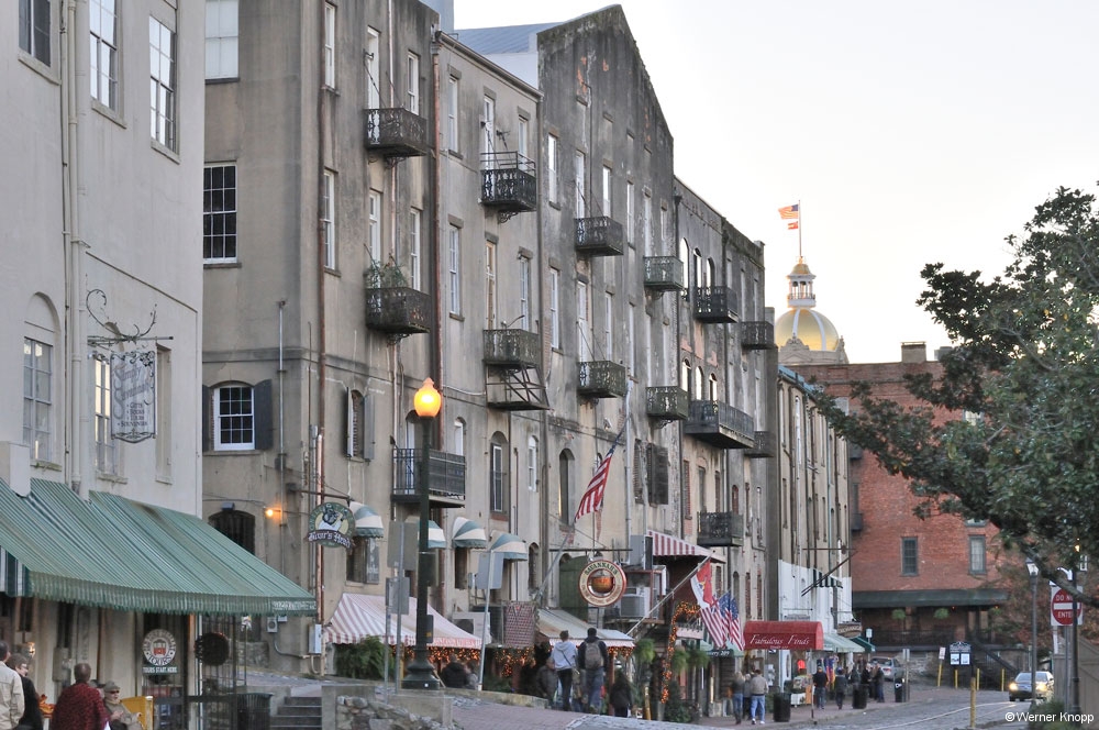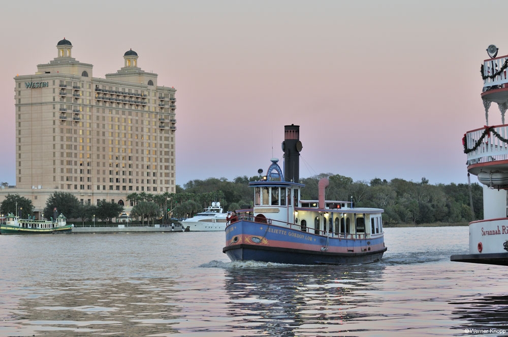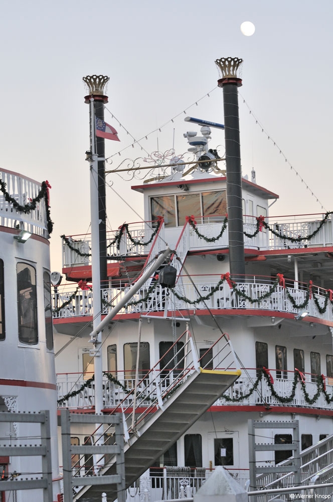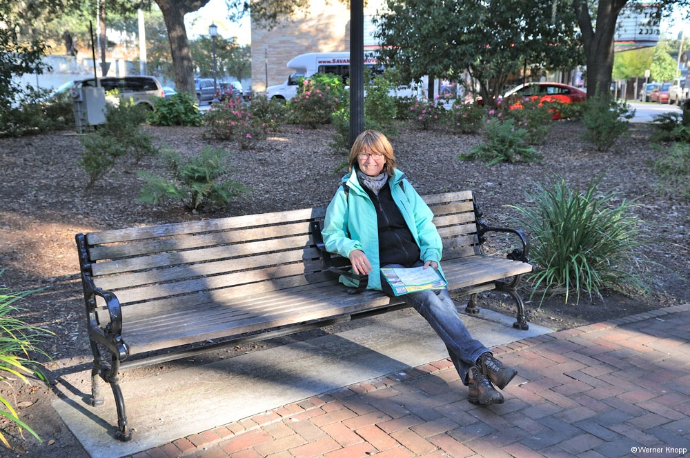 Wurden wir schon auf der FĂ€hre an frĂŒhere Zeiten erinnert, rundeten die auf der Stadtseite liegenden Raddampfer das Bild ab. Sie waren weihnachtlich geschmĂŒckt, ganz ungewohnt bei den Temperaturen. Obwohl es nicht ganz so warm war an diesem Tag, die Temperaturen schwanken hier sehr. Eigentlich wollten wir gerne eine Fahrt mit der Pferdekutsche machen, aber es war gerade keine frei, so dass wir „per pedes“ durch die Stadt marschierten. Eine GrĂŒnanlage  nach der anderen, (24 Square), lud zum Verweilen ein. Wie schön muss das an einem warmen Sonnentag sein! đ Die ganze Stadt ist grĂŒn. So viele BĂ€ume (Palmen und Oak Trees) wie in Savannah habe ich noch in keiner Stadt gesehen. Einige StraĂen mit einem grĂŒnen Mittelstreifen waren sogar als GrĂŒnflĂ€che im Stadtplan eingezeichnet. Schöne HĂ€user aus dem 19. Jahrhundert waren in diesen StraĂen zu sehen. Auf dem Weg zum groĂen „Forsyth Park“ kamen wir aber auch durch einfachere StraĂen. In diesem schönen Park suchten wir die Bank, auf der „Forrest Gump“ auf den Bus wartete. Vergeblich! Sie stand am Chippewa -Square. Auch dort suchten wir sie vergeblich, denn sie wurde inzwischen abgebaut. đ đ đ
