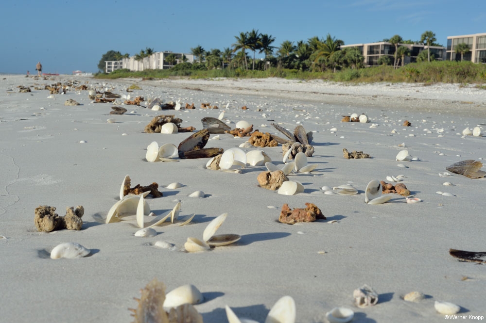 Die Insel ist bekannt für ihre schönen Muscheln, die aber auch von Profis gesammelt werden. An einem Tag standen wir früh auf, um die ein oder andere besondere Muschel zu finden. Vergeblich! Der Strand war voller Menschen, die die gleiche Idee hatten! 😉 Also begnügten wir uns mit einem langen Spaziergang und staunten, was so alles aus dem Golf von Mexiko an Land gespült wird…