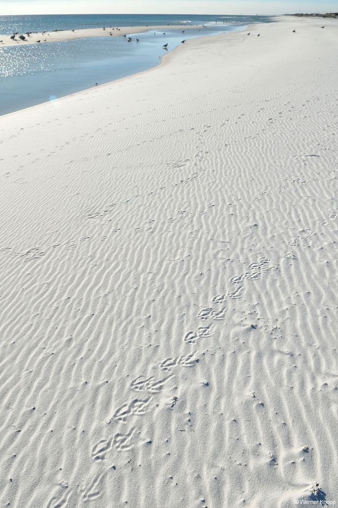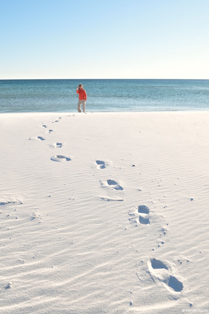 Der State Park ist in verschiedene Bereiche eingeteilt, Tagesbesucher, Campingbereich, Hafen etc.. Am Ende der Insel liegt das Gebiet „Wilderness Preserve“, für das man sich eine Erlaubnis holen musste. Hier liefen wir meilenweit durch unberührte Natur und trafen kaum jemanden. Einfach herrlich! Frische Spuren wiesen auf Wild hin; ein Wanderer zeigte uns stolz ein Foto, auf dem ein Hirsch zu sehen war. 🙂 Die Dünen und der Strand waren in diesem Bereich der Insel einfach umwerfend! Bei den niedrigen Temperaturen gingen wir durch den schneeweißen Sand wie durch Schnee! Da es uns hier so gut gefiel, fuhren wir am nächsten Tag mit unseren Rädern wieder an diese Stelle. Für kurze Zeit kam die Sonne zwischen den Wolken heraus und schon hatte Werner einige gute Bilder im Kasten. 😉
