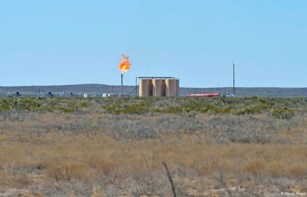 Die nächste Etappe ist von Ölbohrungen geprägt, 160 km nichts Anderes als Steppe mit Bohrfeldern und großen Tanks! Dazwischen liegt eine Ranch, Heuballen liegen auf den Feldern und Rinder grasen. Dass auf dieser Straße viele Tanklastwagen unterwegs sind, die viel zu schnell fahren und uns ständig überholen, wen wundert´s!?