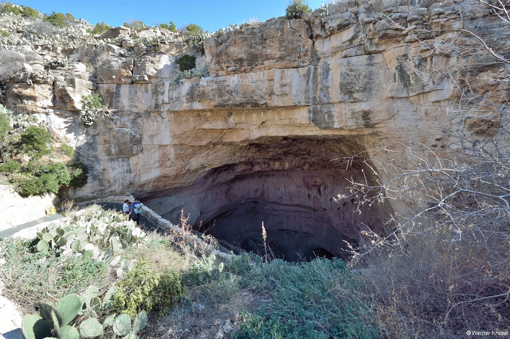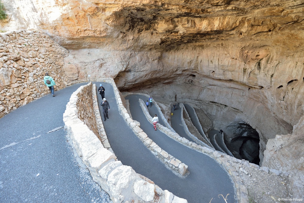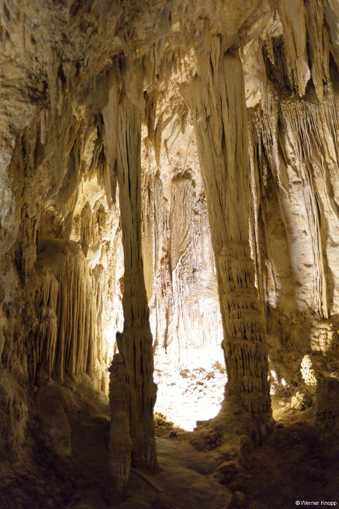 Um zu den Carlsbad Caverns zu gelangen, mussten wir zuerst die Guadalupe Mountains hoch fahren, um dann 230m tief in die Höhle hinabzusteigen. Schon der Eingang der Höhle war beeindruckend! Von April bis Oktober schwärmen hier Tausende von Fledermäusen (Brasilianische Bulldog – Fledermäuse) aus, um auf Insektenjagd zu gehen. – Eine Stunde (1 Meile) ging es bergab, der Weg schien nicht aufzuhören…Wir entdeckten interessante Formen, die hier in Tausenden von Jahren entstanden waren.