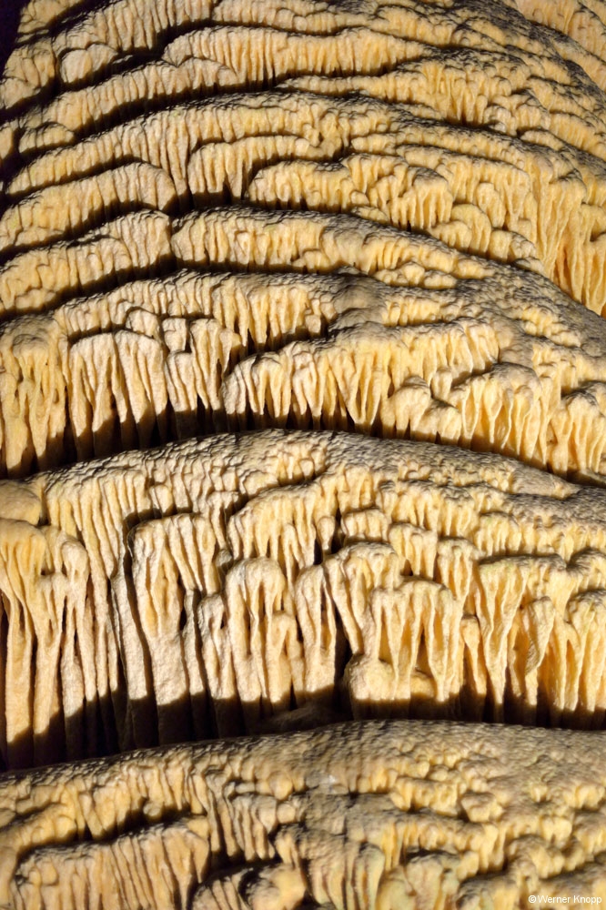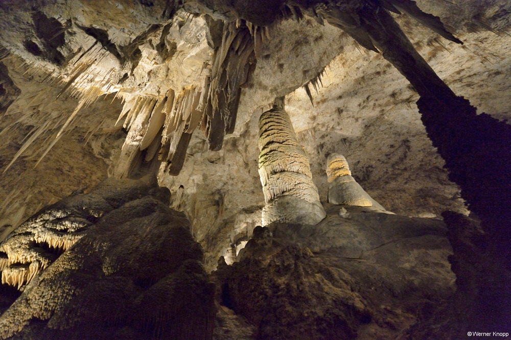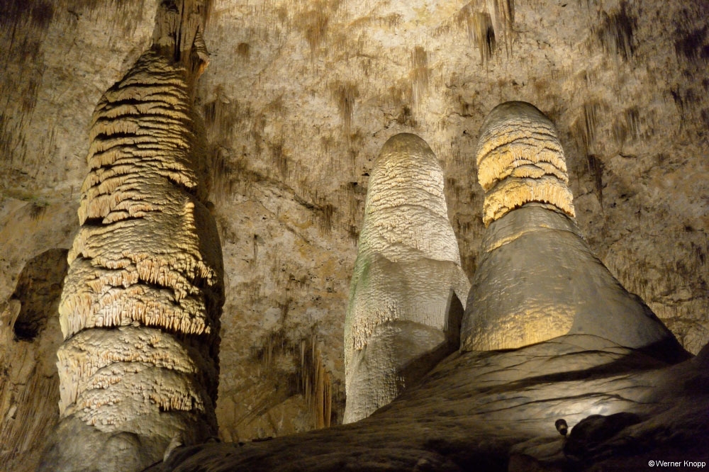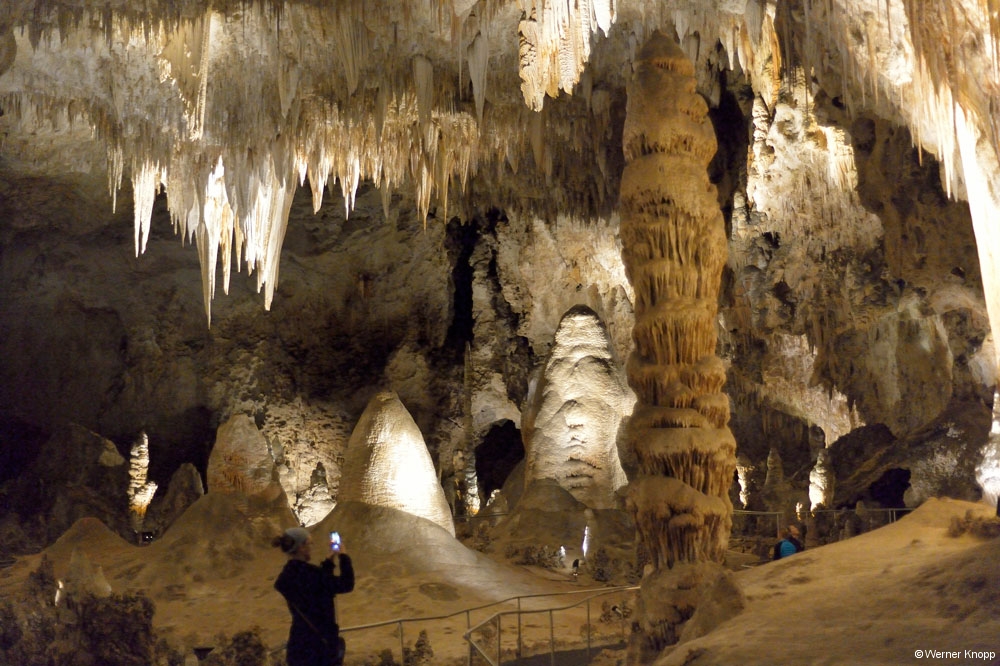 Die schönsten Formationen fanden wir jedoch im „Big Room“, der sich in 230 m Tiefe befindet. Mit einer Länge von 540 m und einer Breite von 330 m deckt er 14 Fußballplätze ab. 😉 Hier kamen wir aus dem Staunen nicht mehr heraus. Neben den Stalagmiten und Stalagtiten sahen wir noch viele andere bizarre Formen. Manche Figuren waren mit einem Namen versehen, z.B. „Bottomless Pit, Rock of Ages, Giant Dome“. Oft konnten wir jedoch unsere Phantasie spielen lassen oder uns einfach an den Formationen erfreuen. 🙂