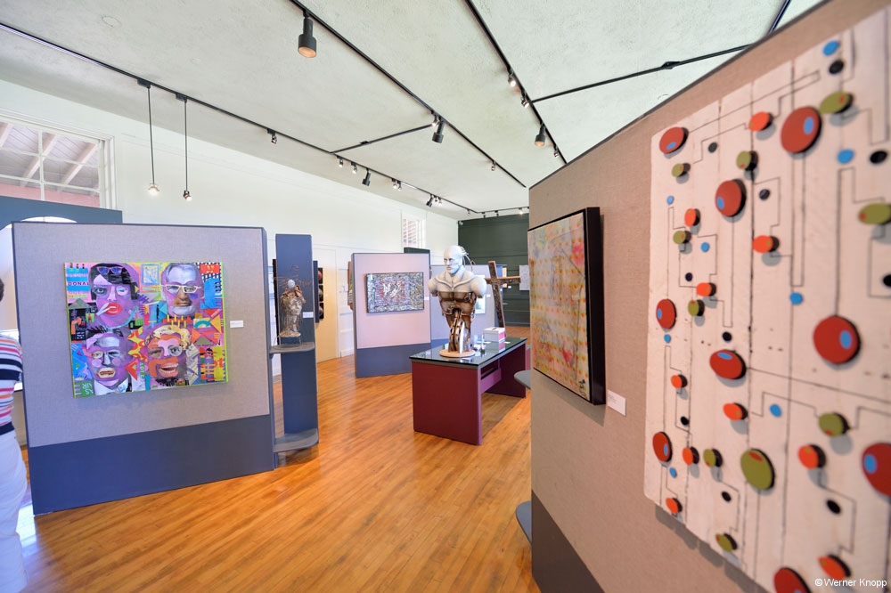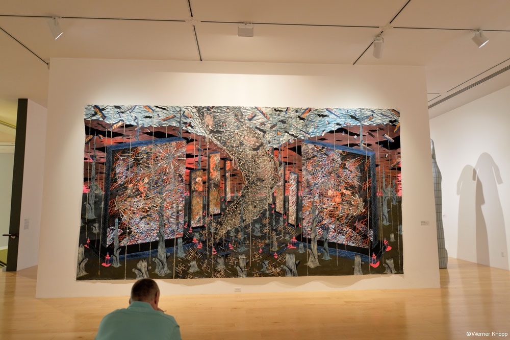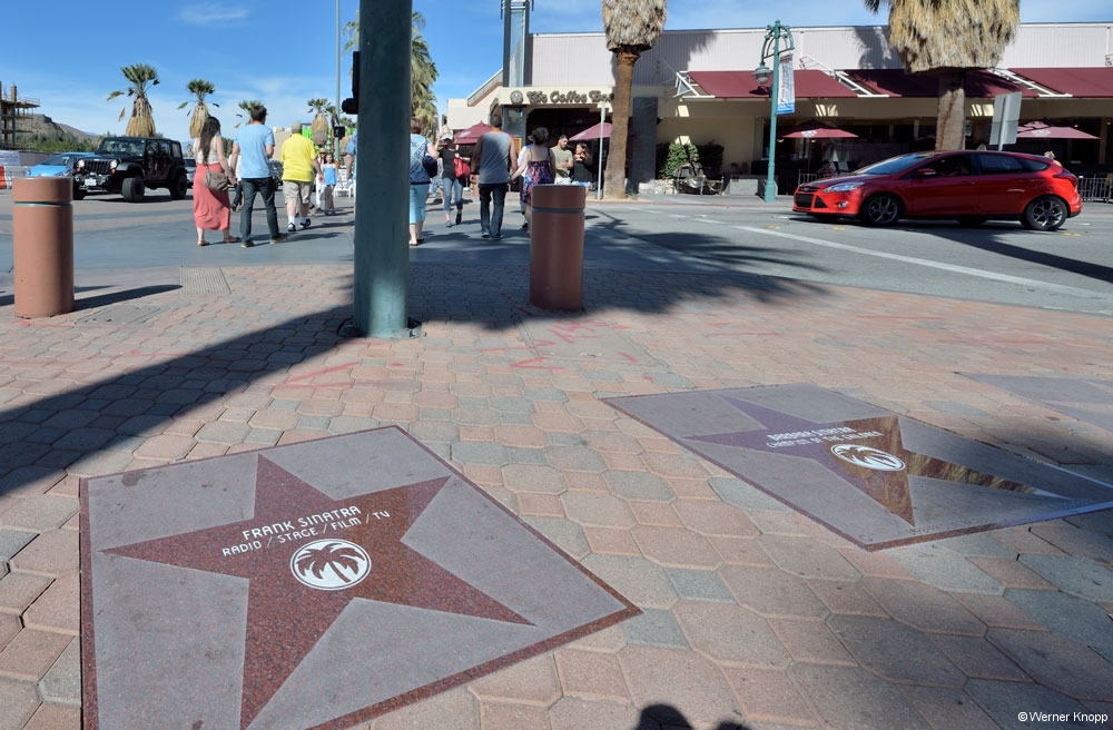Es war viel los an diesem verlängerten Wochenende und wir spazierten auf der Flaniermeile mit vielen ansprechenden Restaurants. Dort sind auf dem Bürgersteig Sterne eingelassen mit den Namen vieler bekannter Persönlichkeiten (Film/Musik/Politik), uns waren nur wenige bekannt. 😉 Bei der Hitze gönnten wir uns ein Eis 🍦, eine Riesenkugel für 4$ – richtig lecker! Die Häuser erinnern an spanische Architektur. Da sich in der Stadt eine vitale Kunstszene entwickelt hat, konnten wir uns eine interessante Ausstellung ansehen: