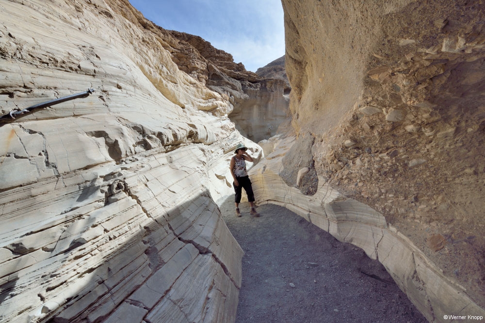 Beim „Harmony Borax Works Interpretive Trail“ informierten wir uns über den Boraxabbau und die Verarbeitung im D.V.. Im Badwater Basin spazierten wir 86 m unter dem Meeresspiegel auf einer dicken Salzschicht. Wenn es regnet, werden Mineralien und Salze aus den umliegenden Bergen heraus gewaschen und sammeln sich an diesem tiefsten Punkt im Tal. Ganz in der Nähe konnten wir beim „Devils Golf Course“ bizarre Salzformationen sehen. Es war nicht leicht auf diesem „Untergrund“ zu gehen.
