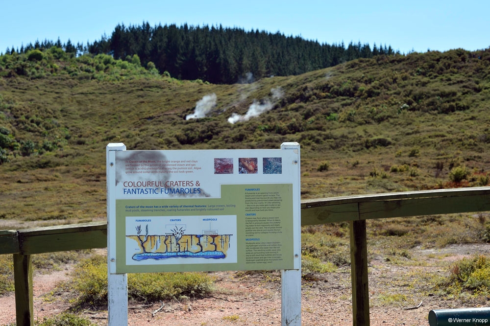 Nach diesem spritzigen Ereignis begegneten wir in einem Thermalgebiet mit dem Namen „Craters oft the Moon“ einem ganz anderen Phänomen. Knapp unter der Erdoberfläche herrschen hier sehr hohe Temperaturen. Grund- oder Regenwasser, das durch Erdspalten nach unten dringt, wird erhitzt und sucht sich als Dampf wieder einen Weg nach oben. 🤔1991 brachen Autos, die hier auf dem Parkplatz standen, in die Erde ein. 😳Daraufhin wurden Holzbohlenwege angelegt, so dass Besucher sicher durch dieses Gebiet gehen können. 😊Bevor diese Wege angelegt wurden, kam es auch vor, dass Menschen auf porösen, heißen Boden traten und sich die Füße und Beine verbrannten.