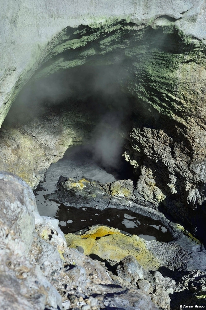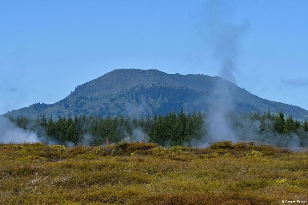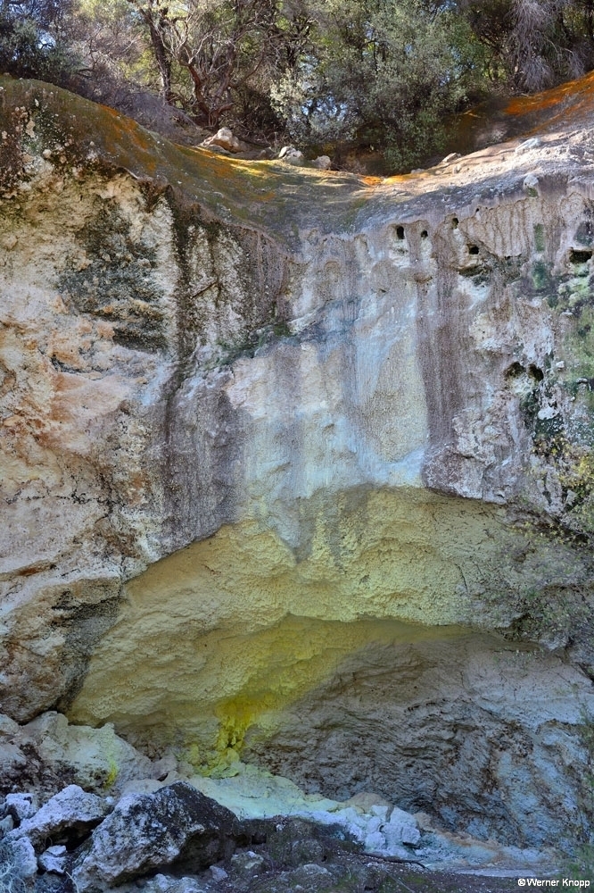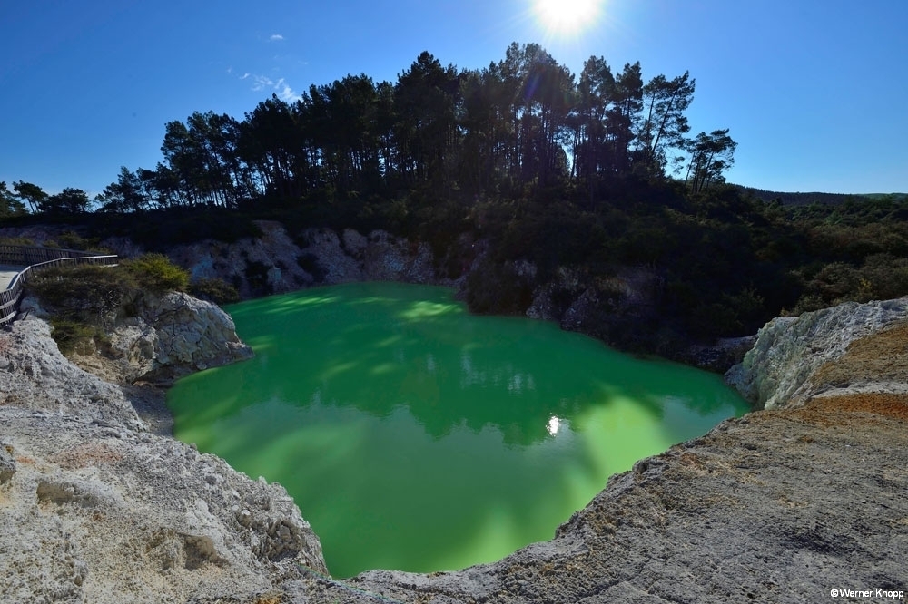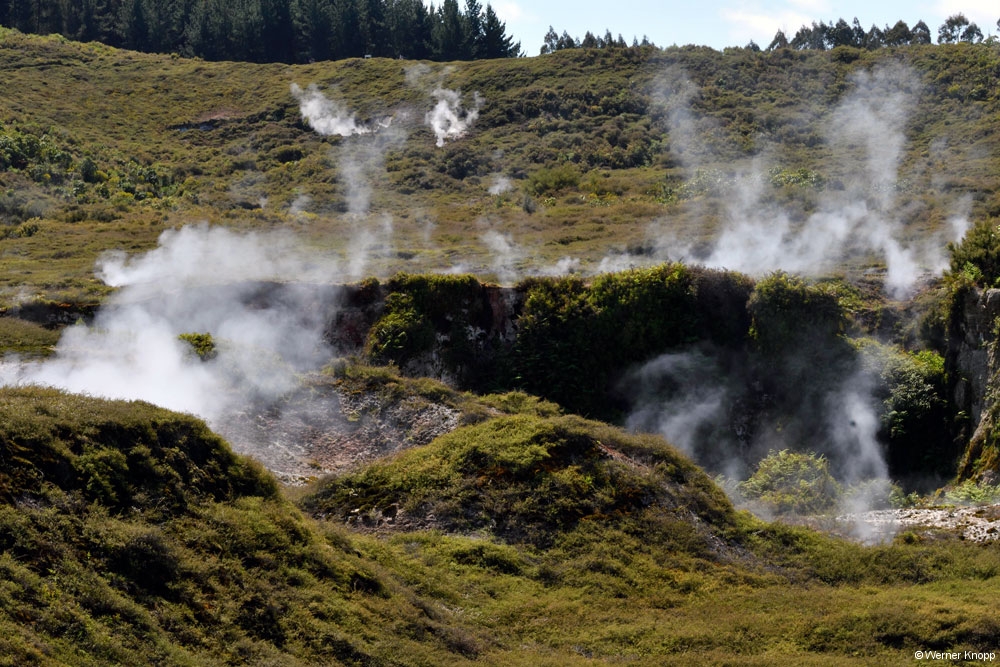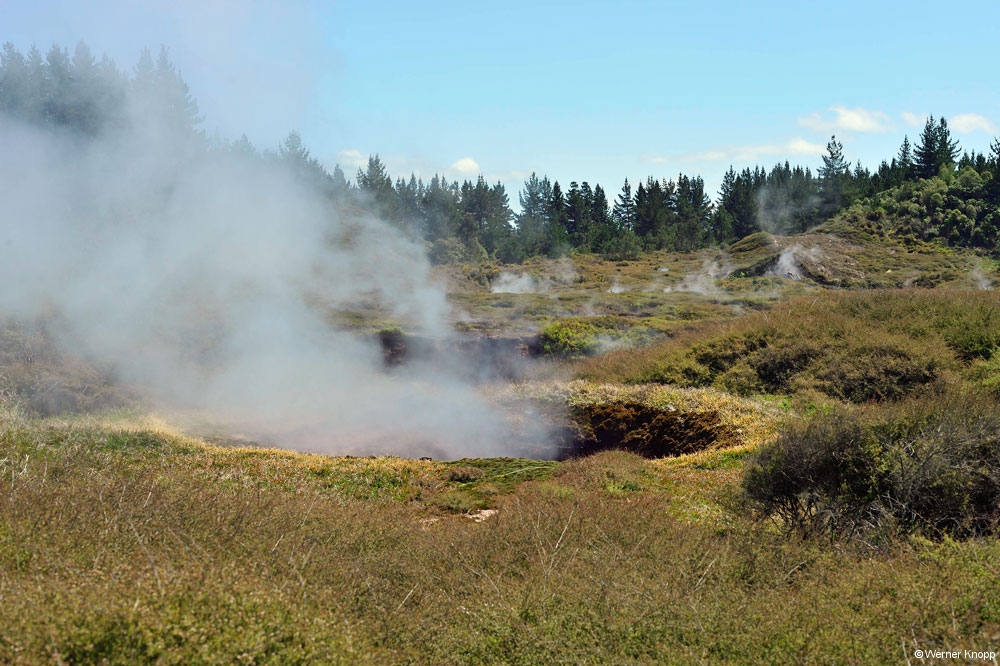 Zum nahe gelegenen geothermischen Kraftwerk zog es uns nicht hin. Im Nachhinein wäre es sicher einen Besuch wert gewesen. 🙃 Wir entschieden uns für den Besuch des „Thermal wonderlands“ Wai-o-Tapu – „heiliges Wasser“. Leider war dieses spannende Gelände nur bis 17 Uhr geöffnet; ich hatte mit der Sommerzeit (-18 Uhr) gerechnet. ⌛️In diesem 18 Quadratkilometer großen Thermalgebiet ist ein kleiner Teil für Besucher zugänglich. Es steht unter Landschaftsschutz und stellt die größte Thermalfläche in der Vulkanumgebung Taupos dar. 🌋Das ganze Gebiet ist übersät mit kollabierten Kratern, heißen und kalten Seen, Schlammtümpeln und dampfenden Erdspalten. Verschiedene Mineralien lassen die Erde und das Wasser in leuchtenden Farben erscheinen. 🧡💛💚Wir genossen den traumhaften Rundgang, auch wenn der Schwefelgeruch uns auf Schritt und Tritt folgte. Besonders beeindruckend waren die Farben im 62 m tiefen „Champagne Pool“ und im durch Arsensulfide grün gefärbten „Devil´s Bath“. Zufrieden und erschöpft fuhren wir am frühen Abend nach Rotorua. 😊