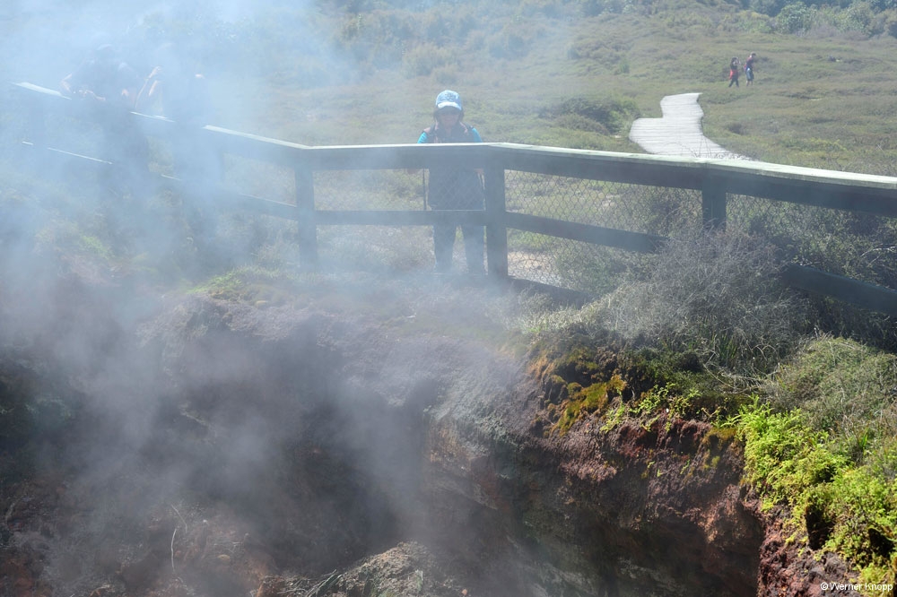 Da hielten wir uns doch gerne an die Hinweise und kamen nicht vom Weg ab…. 😉 Überall dampfte, rauchte und zischte es, eine ganz neue Erfahrung für uns! Die Krater entstehen immer dann, wenn die Dämpfe nicht nach außen dringen können. ♨️Der Druck wird so groß, dass beim Austritt Erde und Steine mit herausgeschleudert werden. 2002 war der letzte Ausbruch, der viele Wege mit Schlamm und Asche bedeckte. Es war ziemlich warm an diesem Tag. ☀️ Ob es an der heißen Erde lag? Lange hielten wir uns auf diesem Gelände auf und beobachteten das Schauspiel. ⏱ Danach gönnten wir uns erst einmal ein leckeres Eis. 🍦