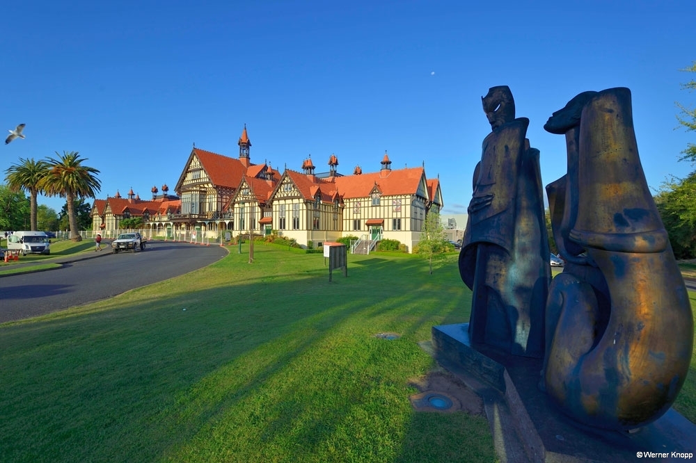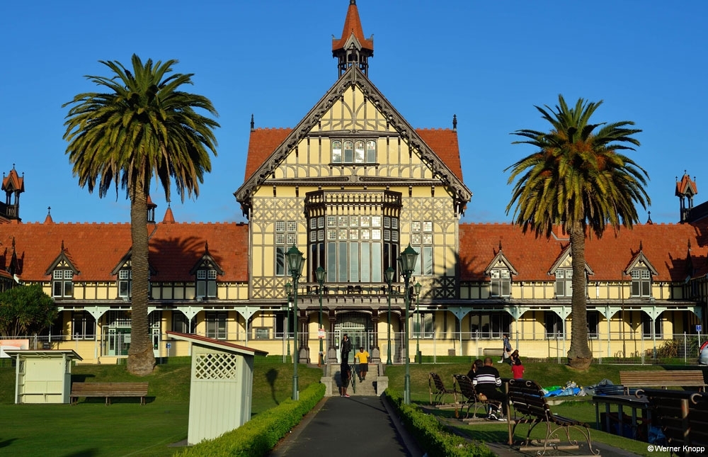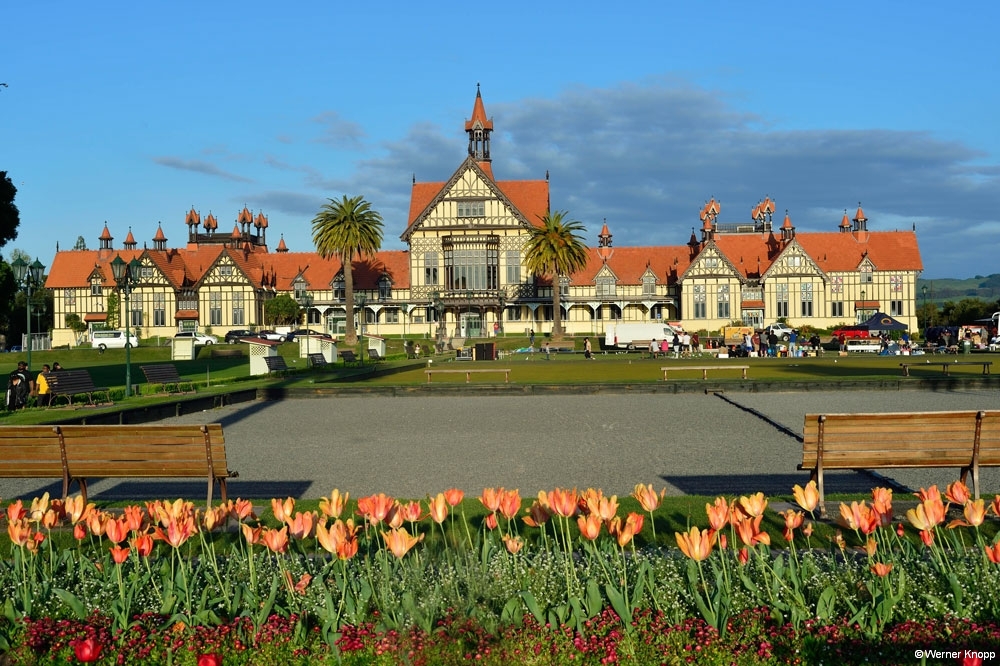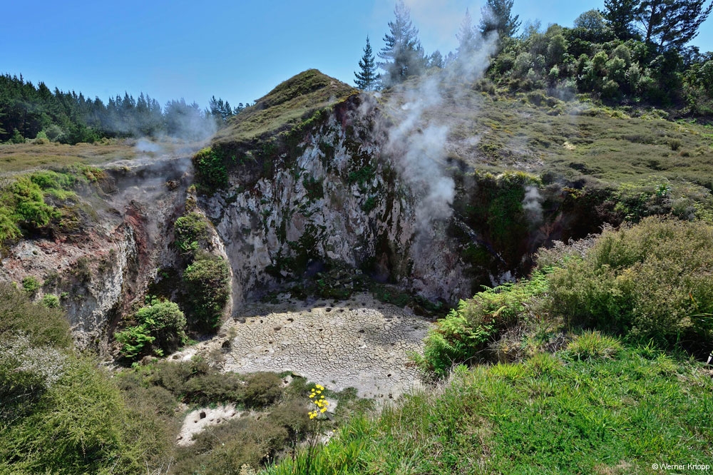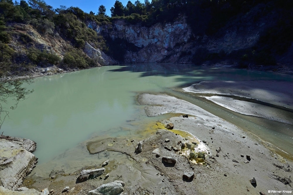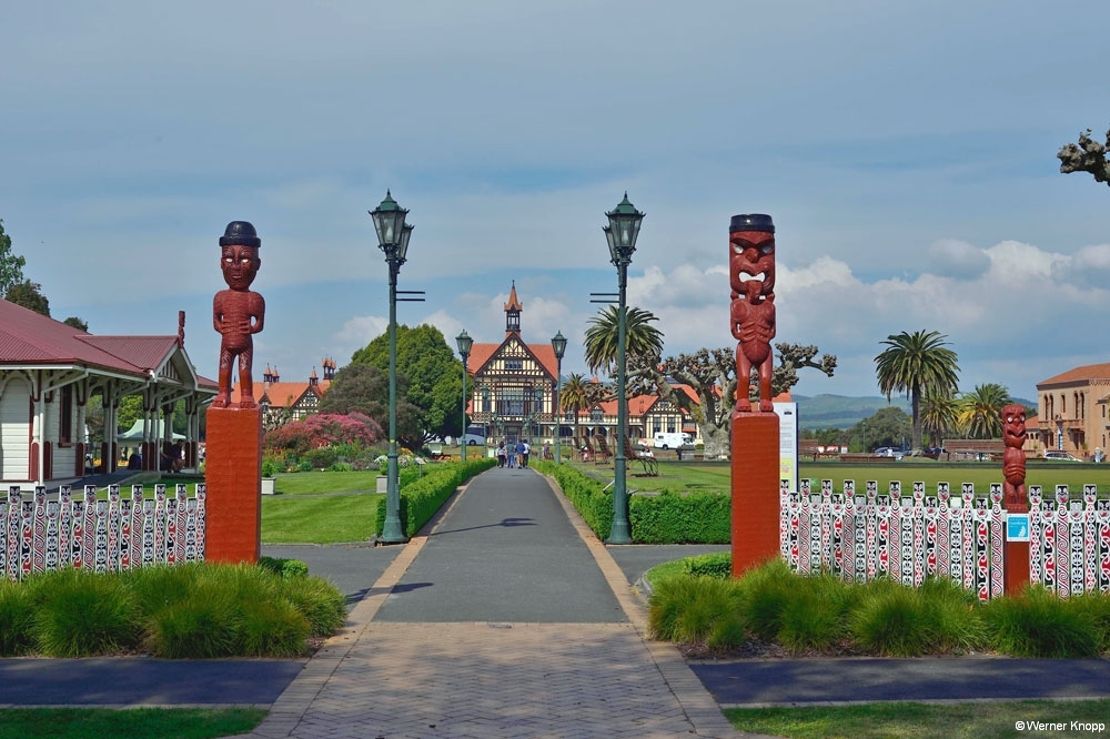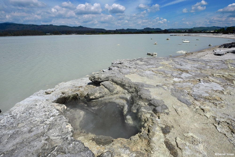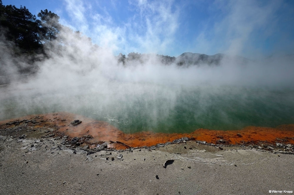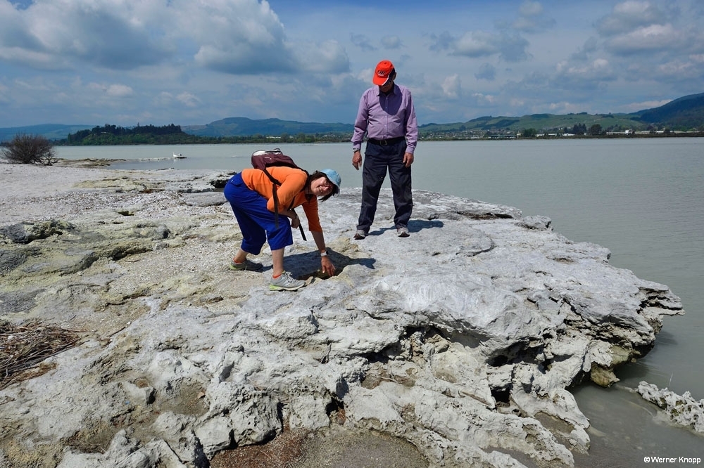 Rotorua – ursprünglich ein Maori-Dorf – ist ein quirliger touristischer Ort, der uns gefiel. Dem penetranten Schwefelgeruch konnten wir nicht entgehen, wir gewöhnten uns ein wenig daran. 😉 Die erste Nacht verbrachten wir auf einem außerhalb liegenden NZMCA-Platz, aber schon am nächsten Tag standen wir mit unserem Womo mitten in der Stadt an einem kleinen Teich mit Springbrunnen und Froschkonzert, herrlich! 🐸Durch Zufall entdeckten wir den Sulfur Bay Walkway am Lake Rotorua. Ein Teil des Sees gehört zum geothermalen Gebiet, überall sind Schilder mit der Aufschrift „Danger“ zu sehen. ‼️Überaus vorsichtig – immer schön auf dem Weg bleibend – blickten wir auf den See und das ungewöhnlich aussehende Ufer. Ein älterer Herr kam des Weges, sprach uns an und machte eine kleine Führung mit uns. Zaghaft gingen wir auf das verbotene, fragile Gebiet und ließen uns alles erklären. 🧐Es blubberte an vielen Stellen – spannend und viel interessanter als vom Weg aus! Mit einer leckeren „Seafood chowder“ stärkten wir uns an diesem Tag. 🍜