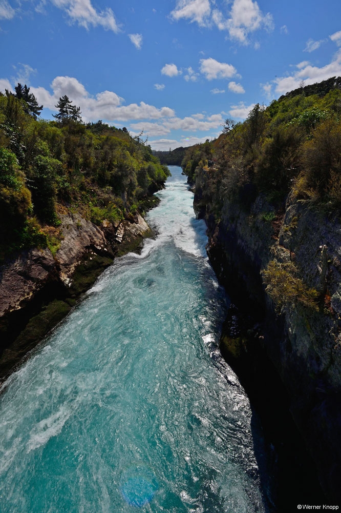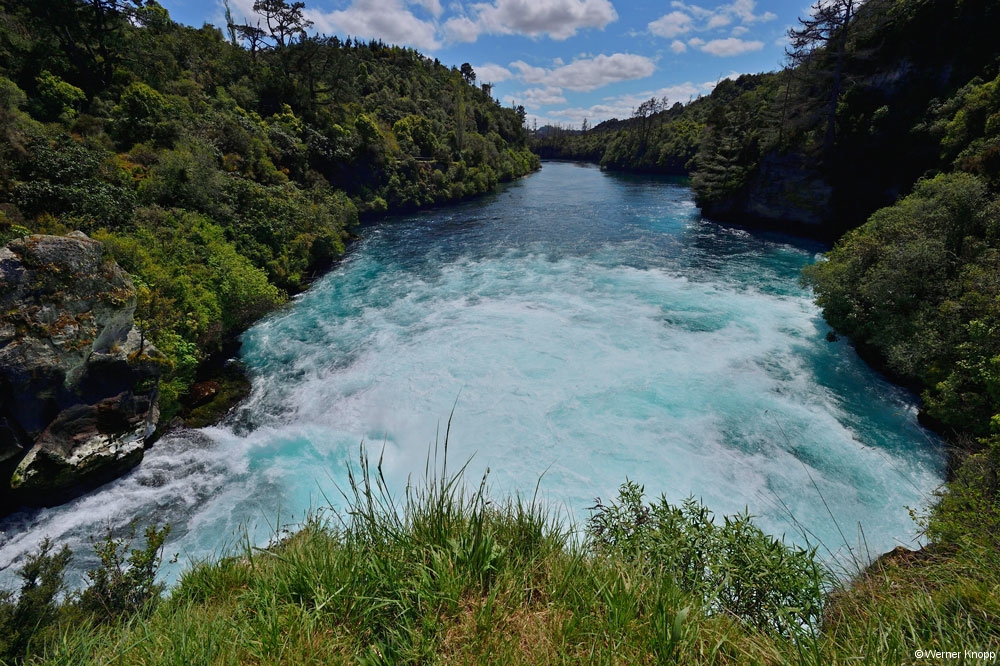 Nach dieser Wanderung fuhren wir auf dem „Thermal Explorer Highway“ in das Zentrum der geothermalen Zone. Nun hatten wir die Qual der Wahl: Welche besonderen Stellen wollen wir erkunden? Es gibt hier unendlich viel anzuschauen. Zuerst fuhren wir zu den nahe gelegenen Huka Falls, wo der Waikato River durch eine schmale Schlucht tost. Über 200 000 Liter Wasser stürzen in jeder Sekunde über eine 9 m hohe Felskante in ein tiefes Becken. 💧💧💧
