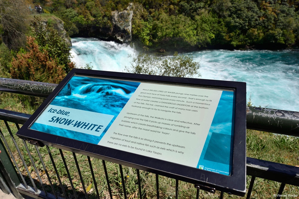 „Ice-blue, SNOW-WHITE“ Das sind die Farben, die wir hier bestaunten und mit uns eine große Schar von Touristen. Wo kamen sie plötzlich alle her? 🚶♀️🚶♂️🚶♀️🚶♂️In der Maori-Sprache bedeutet Huka „schäumend“, was diesen Wasserfall sehr gut beschreibt. Gerade wollten wir diesen schönen Ort verlassen, als ein „Hukafalls Jet“ mit ca. 12 Personen herandüste und seine Runden drehte. Jedem das Seine! 😳