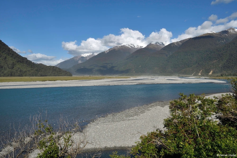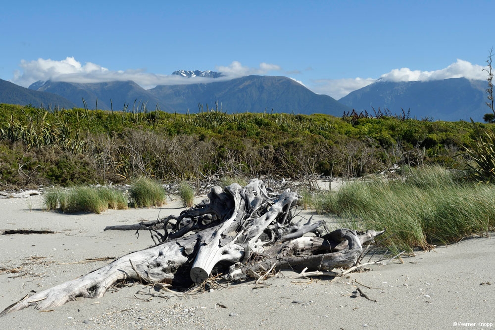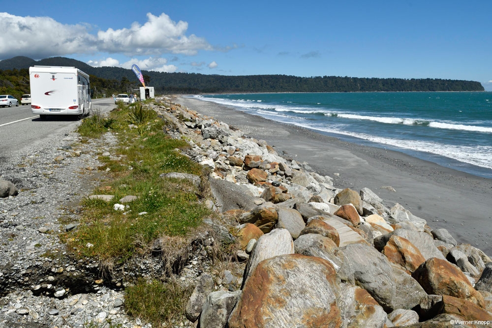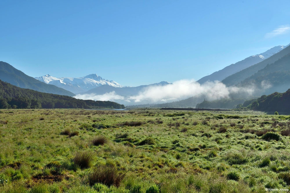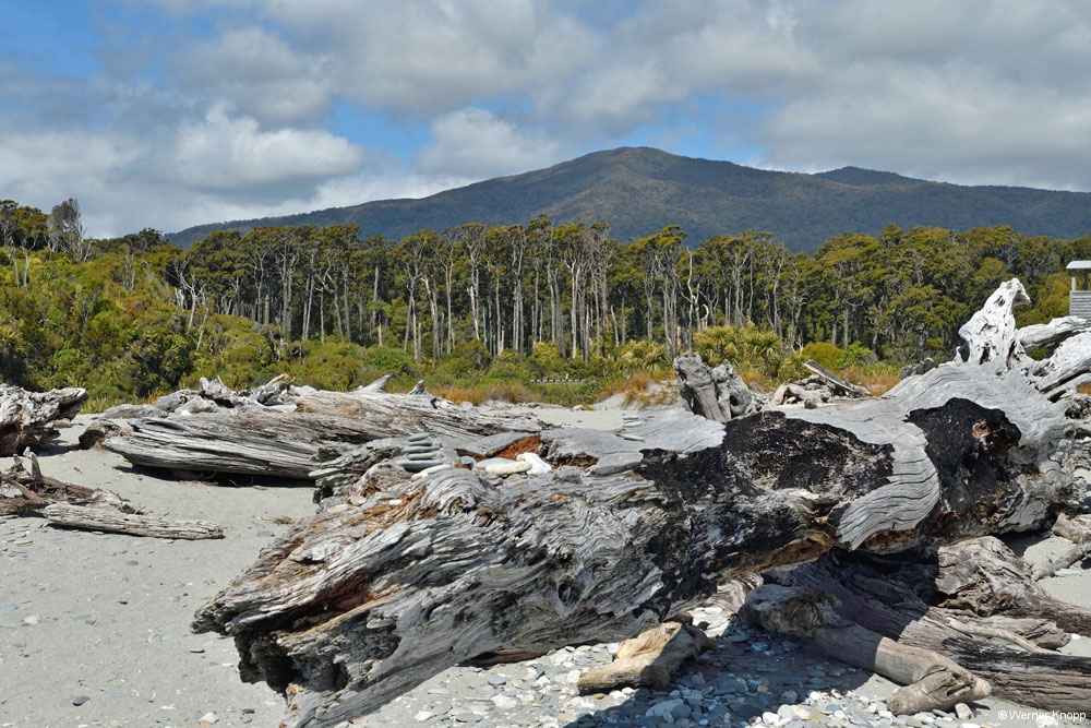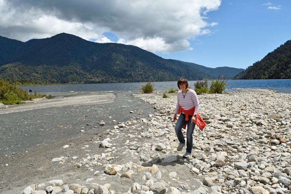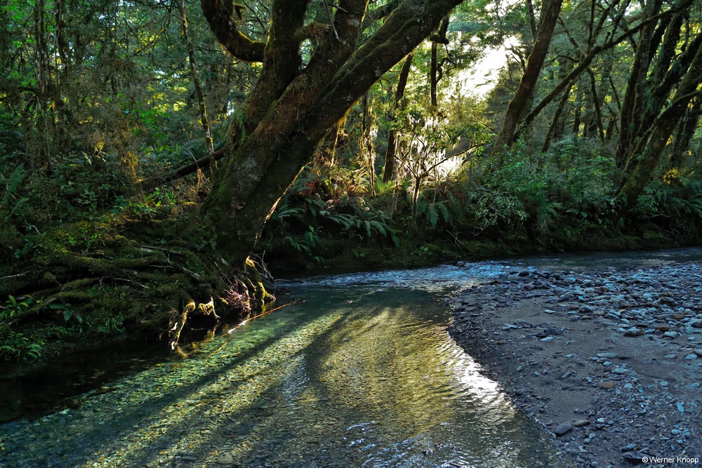 Am Cascade Creek, einem großen DOC-Platz schlugen wir unser Lager mit Blick auf das Wasser auf. Eine Regenpause nutzten wir für einen traumhaften Spaziergang durch einen „Märchenwald“, den „Lake Gunn Nature Walk“.
