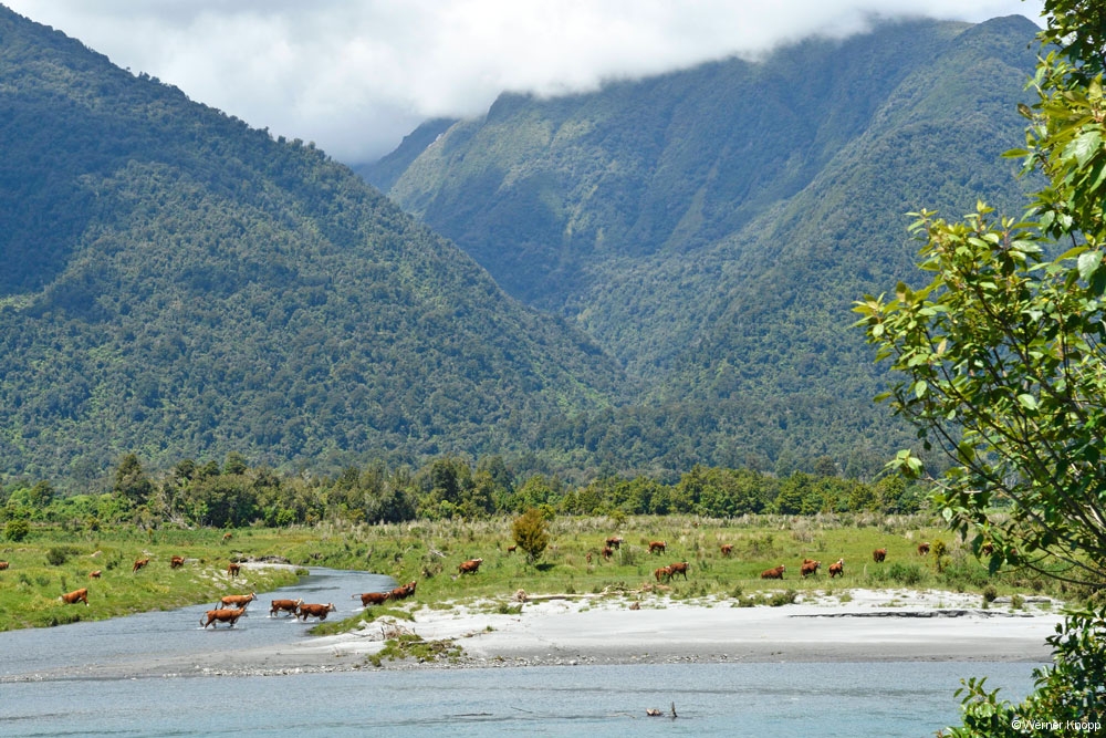 Während der Fahrt nach Te Anau regnete es unaufhörlich. 🌧Nun sahen wir auf vielen Wiesen Rotwild – ganz ungewohnt die Tiere auf einer Weide ohne Bäume zu sehen.🦌🦌
