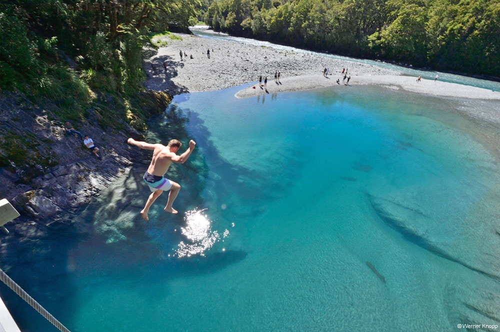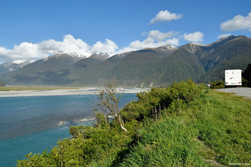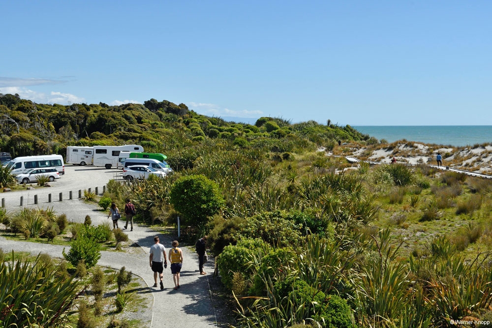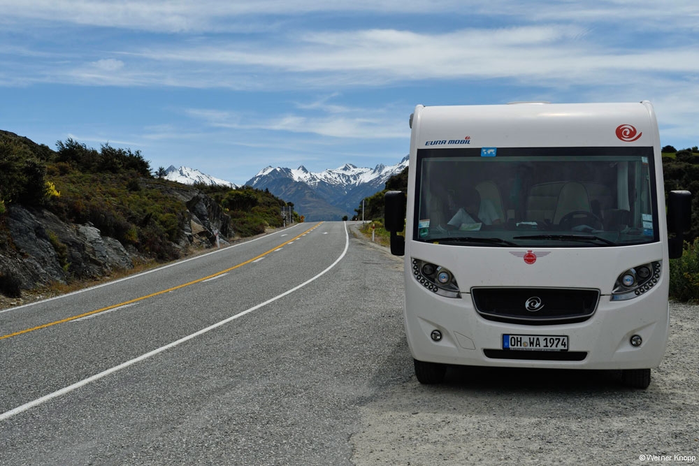 Auf einem Parkplatz sahen wir etwas später einen Kea auf einem Auto sitzen. Der Bergpapagei ist ein endemischer, sehr intelligenter Vogel, der sich dem veränderten Lebensraum angepasst hat. Weder geparkte Autos noch Rucksäcke sind vor ihm sicher. 😉Werner nutzte die Chance und fotografierte den neugierigen Vogel.