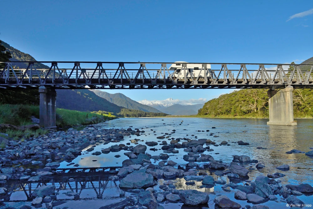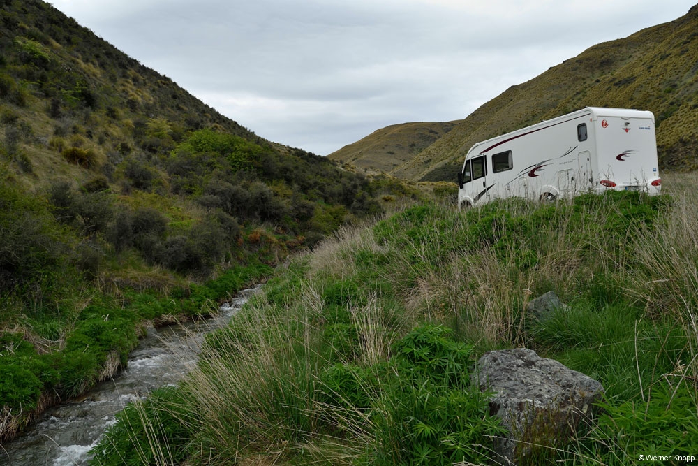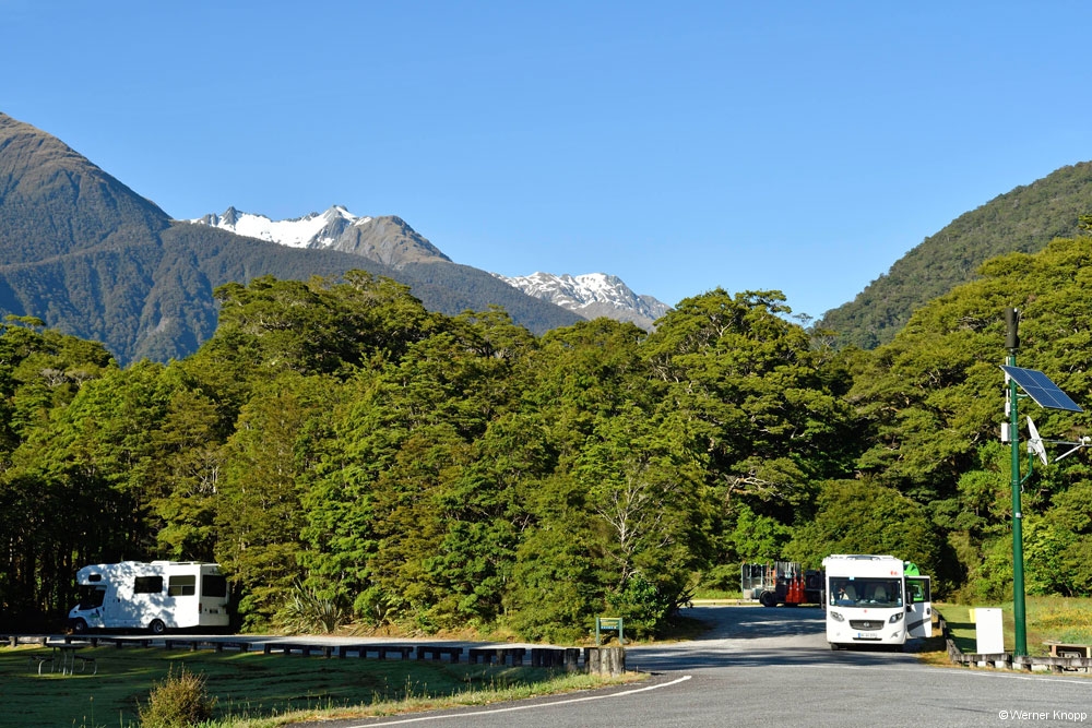 Durchgefroren gingen wir wieder zum Wohnmobil und fuhren die ganze Strecke nach Te Anau zurück. Diesmal mussten wir etwas länger vor dem Tunnel warten. ⌛️Ab und zu hielten wir an, aber zum Wandern lud das Wetter nun wirklich nicht ein. Werner musste bei den Temperaturen um 0 Grad sehr konzentriert fahren und machte nach der Fahrt eine verdiente Pause. 😌