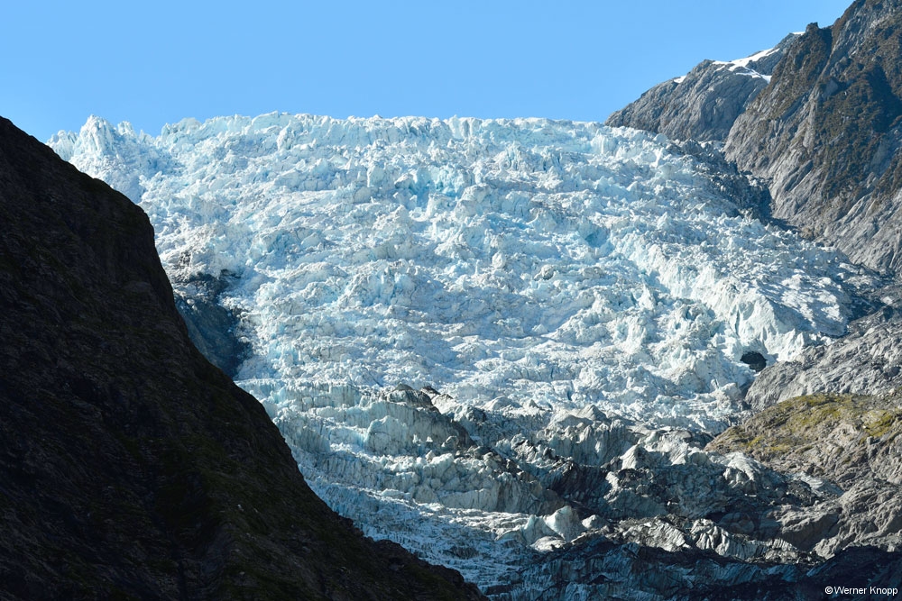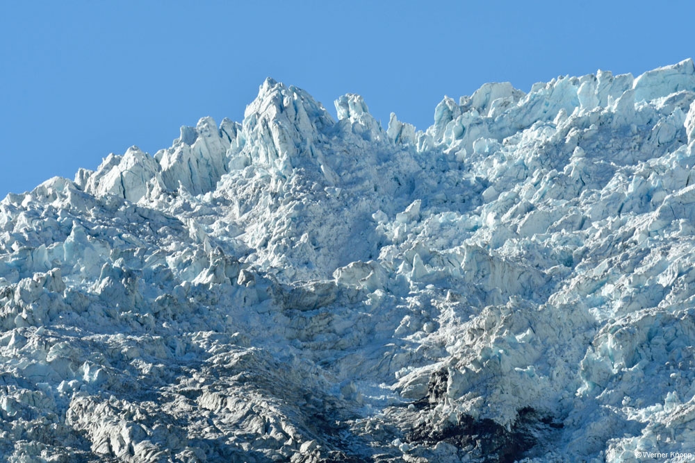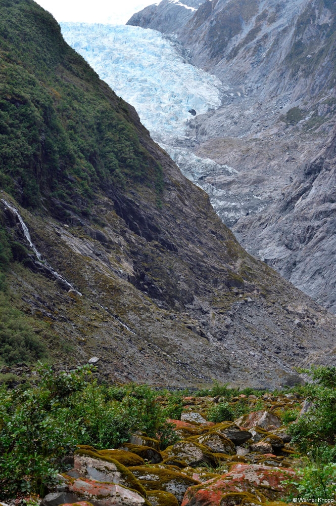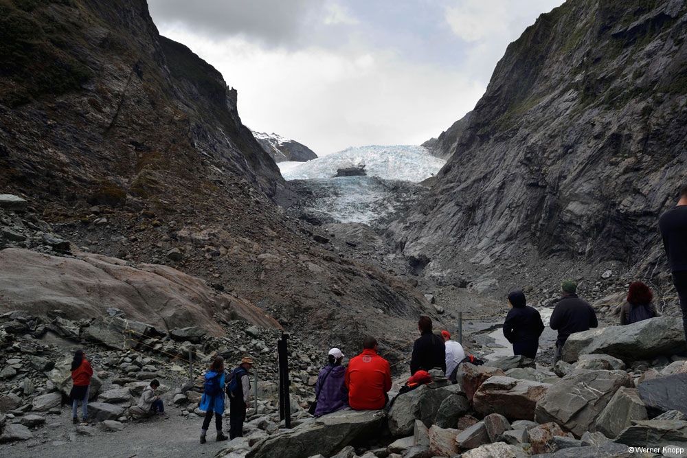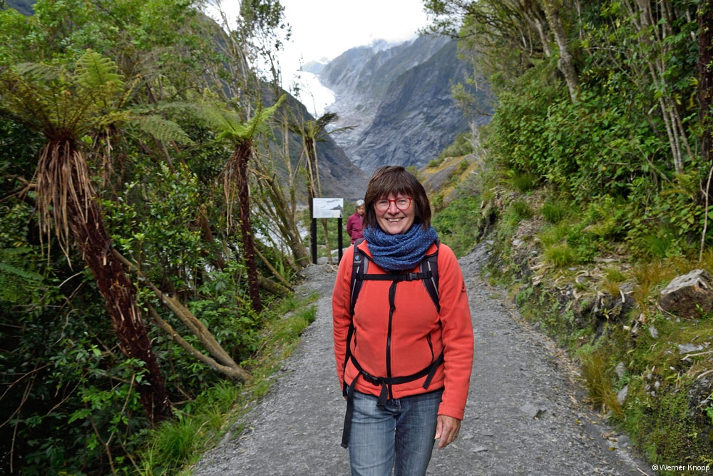 Wir gingen den Douglas Track, der bis in die Nähe des Gletschers führt. Interessante Steine, Wasserfälle, Moose zogen uns magisch an. Viel Wissenswertes steht auf den Infotafeln, die ich meist ausführlich studiere, während Werner sich der Fotografie widmet. Während die Gletscherzunge in den 1980er Jahren dramatisch wuchs, ist sie seit 1999 wieder rückläufig. Der Gletscher bewegt sich ca. 0,5 m pro Tag den Berg hinunter und transportiert eine große Menge Geröll mit sich, was wir hier sehr deutlich sehen konnten. Das Schmelzwasser, der graue Waiho River, strömt schnell den Berg herunter. Das Fach Erdkunde weckte in der Schulzeit nicht mein Interesse. Aber auf unseren Reisen finde ich dies alles äußerst interessant. ☺️ Die Bergspitze war an diesem Tag leider nicht mehr zu sehen, die Wolken hingen in den Bergen fest.
