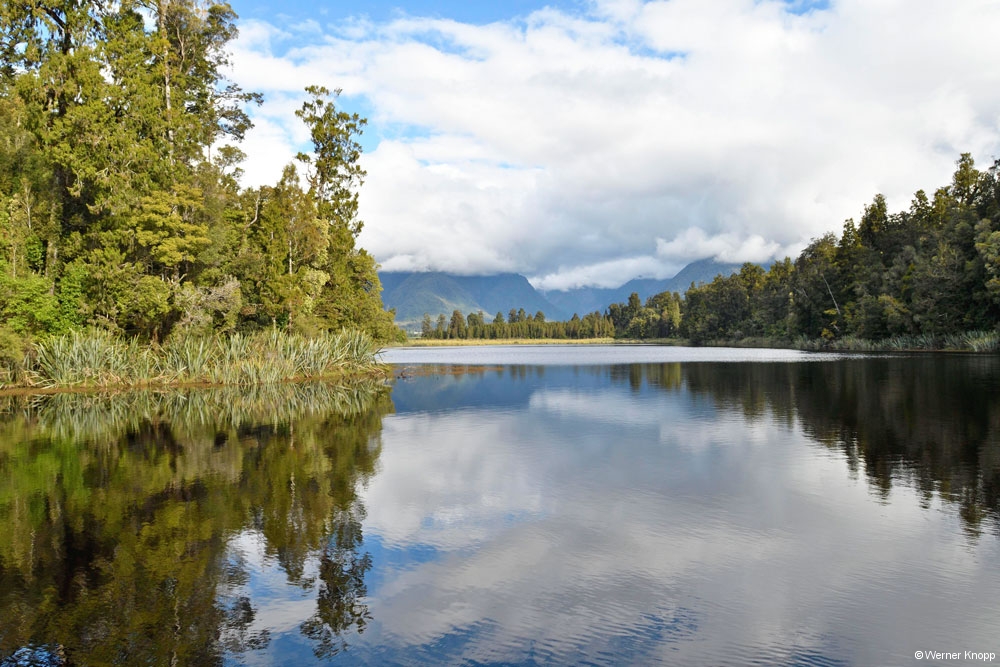 Ein besonderer See in der Nähe war unser zweites Ziel an diesem Tag. Am Lake Matheson, auch „Mirror Lake“ genannt, gibt es eine Stelle, an der der See spiegelglatt ist. Hier kann man bei klarem Himmel die Reflektionen des Aoraki Mt.Cook und des Mt. Tasman sehen. Wie gesagt bei Sonnenschein! 😇Wir wanderten um den See, fanden die besondere Stelle und genossen diesen Ort der Stille. Werner war ganz in seine Fotografie vertieft, vier weitere Touristen saßen auf der Treppe, einer in der Warteschleife. Es spiegelten sich zwar keine Bergspitzen, sondern nur Wolken, aber auch das sah toll aus. ☁️☁️☁️