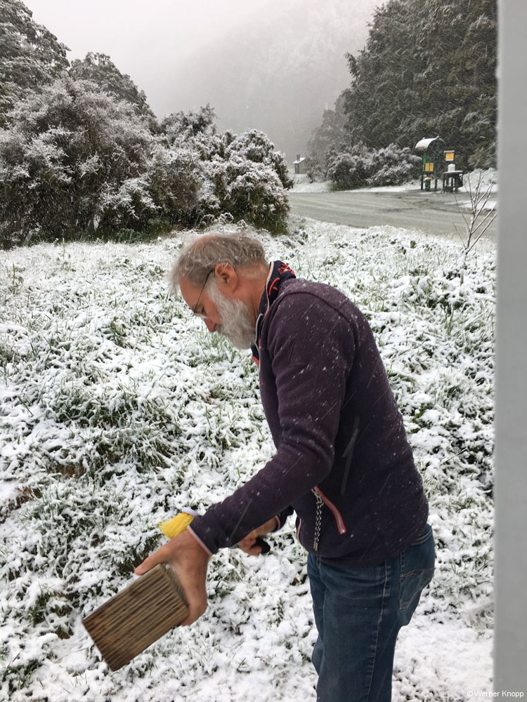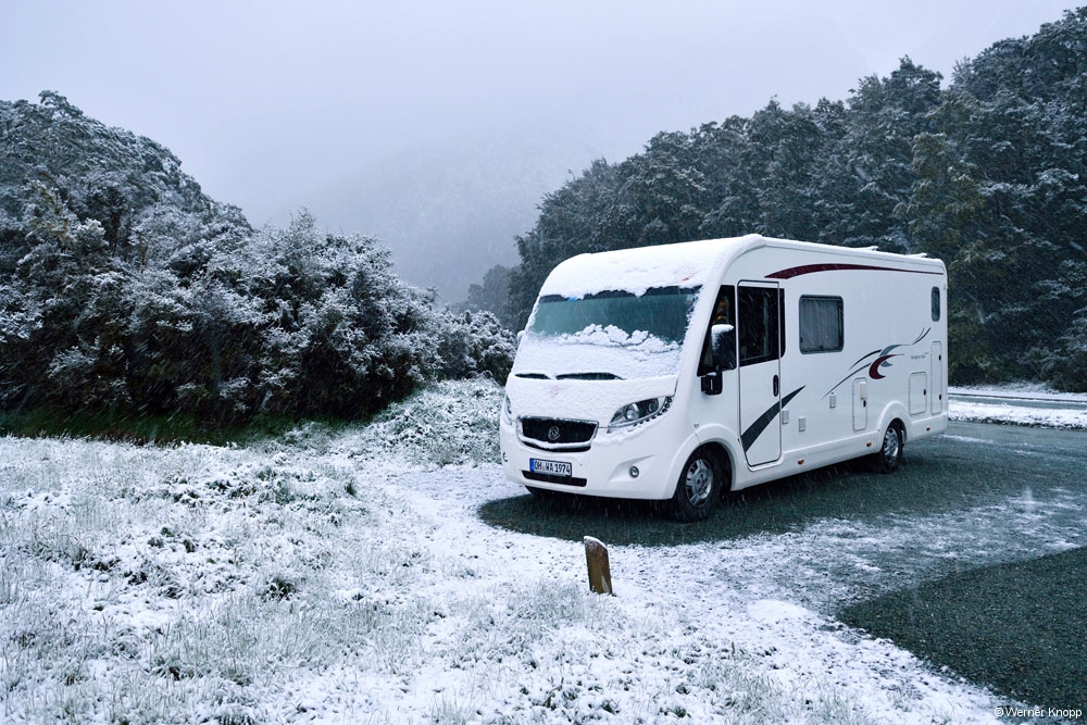 Durchgefroren gingen wir wieder zum Wohnmobil und fuhren die ganze Strecke nach Te Anau zurück. Diesmal mussten wir etwas länger vor dem Tunnel warten. ⌛️Ab und zu hielten wir an, aber zum Wandern lud das Wetter nun wirklich nicht ein. Werner musste bei den Temperaturen um 0 Grad sehr konzentriert fahren und machte nach der Fahrt eine verdiente Pause. 😌