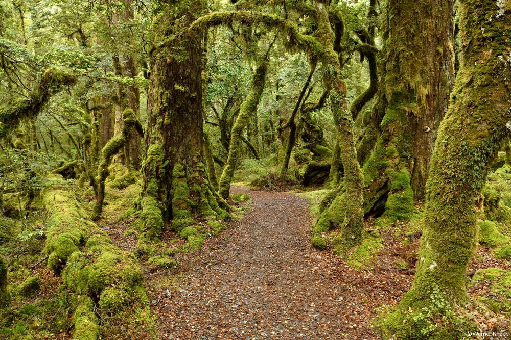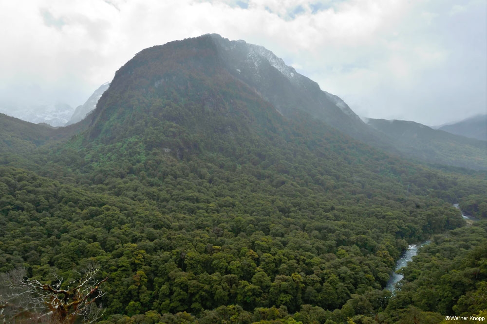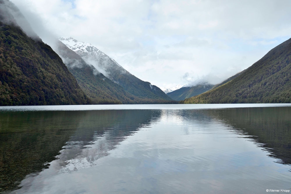 Am Cascade Creek, einem großen DOC-Platz schlugen wir unser Lager mit Blick auf das Wasser auf. Eine Regenpause nutzten wir für einen traumhaften Spaziergang durch einen „Märchenwald“, den „Lake Gunn Nature Walk“.