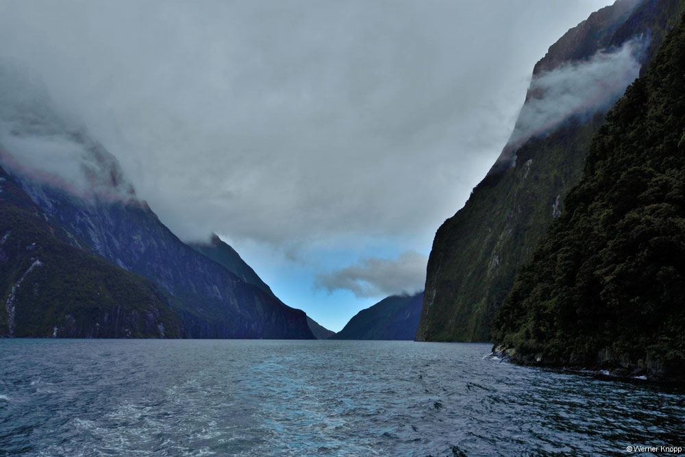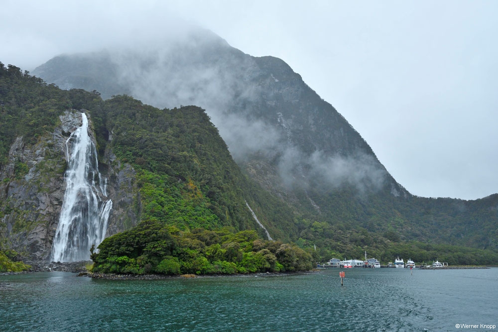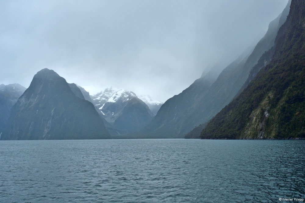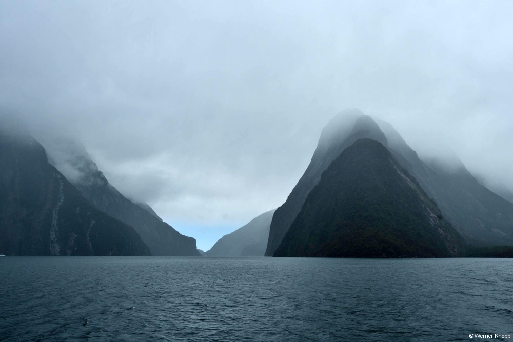 Am Ziel angekommen staunten wir nicht schlecht, denn der Parkplatz war schon fast belegt. Noch lugte die Sonne durch die Wolken hindurch und wir waren sehr gespannt auf die Tour. 🏔Schon um 9.30 Uhr fuhren wir mit dem Schiff in den Milford Sound. Es war ein richtig typisches Fjordland Wetter, wolkig, teils trocken, teils regnerisch. Da war eine heiße Suppe an Bord genau das Richtige. 🍜Der Himmel war voller Wolken, die Berge im Nebel, alles grau in grau.🌫