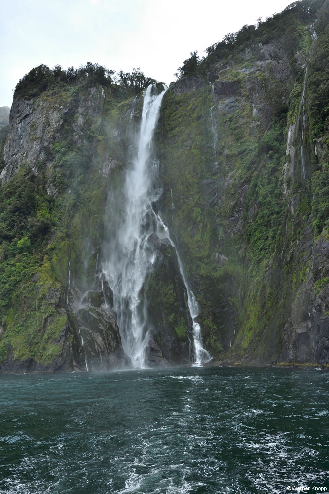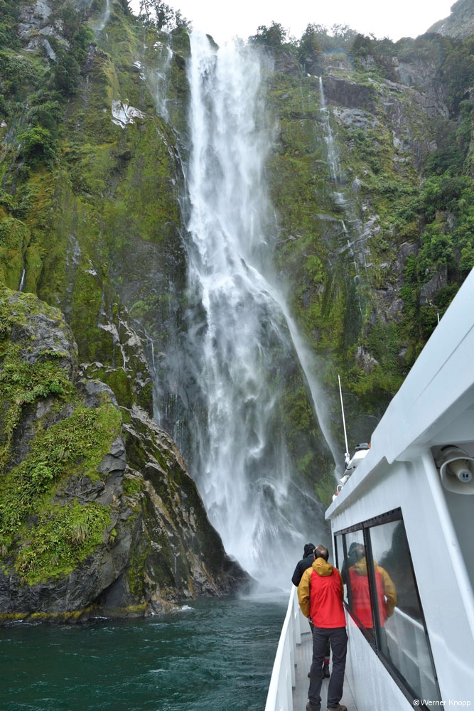 Manchmal fuhr das Schiff nah an das Ufer heran und wir sahen kleine Robben und einige Wasserfälle. Einmal dachten wir, dass wir wieder eine Panne haben, aber nein! Wir fuhren nah an den Wasserfall, dass es nur so spritzte. In dem Moment wurden bereitgestellte Becher mit dem klaren Wasser gefüllt. 💧Es schmeckte erfrischend. Als ich ein Crewmitglied nach dem letzten Sonnentag im Milford Sound fragte, meinte dieser nur: „Sonnentage sind langweilig, heute ist das richtige Fjordwetter.“ 😅