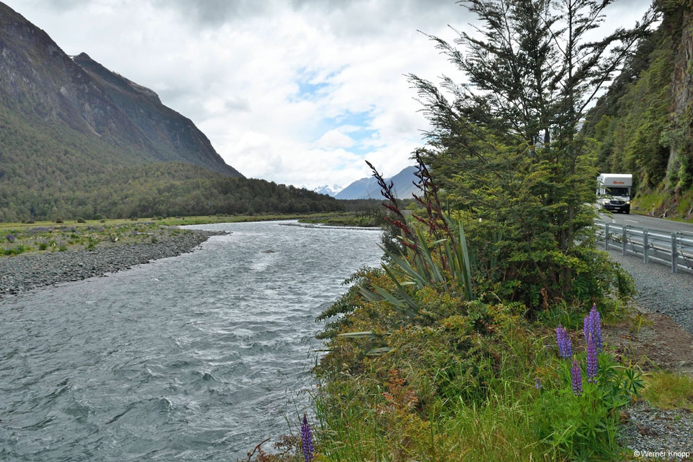 Wir wanderten um den kleinen Lake Mistletoe mit gleichnamigen Bäumen und hielten danach bei den Te Anau Downs an. Die Pioniere brannten das Grasland ab und bewirtschafteten hier das Land. 🔥Die vielen Lupinen, die wir überall blühen sehen, wurden auch von ihnen eingeführt. Wir hielten am Mackay Creek und fuhren durch die schöne Landschaft des Eglington Valleys. Das Wetter war wechselhaft, mal Sonne, mal Regen, einfach ungemütlich! 😳
