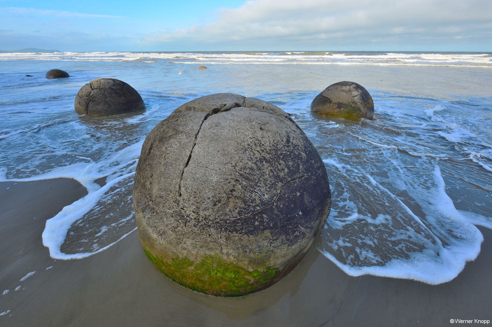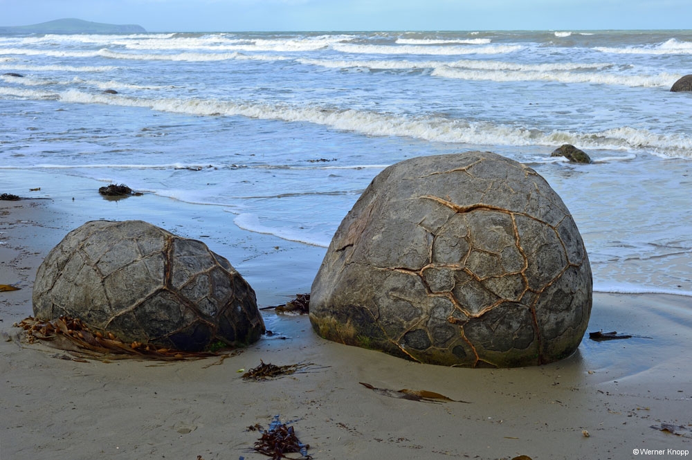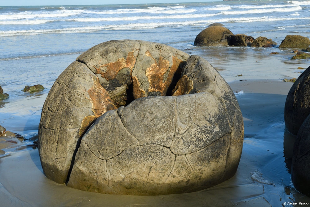 Die Maoris sehen in ihnen die versteinerten Lebensmittel ihrer legendären Kanus. Eine moderne Erklärung besagt, dass sich um eine fossile Muschel oder Ähnliches Calcit und Eisenoxyde abgelagert haben. Dabei stießen die Ionen immer zum Kern der Verhärtung, wodurch die runde Form entstand. 🔴⚫️
