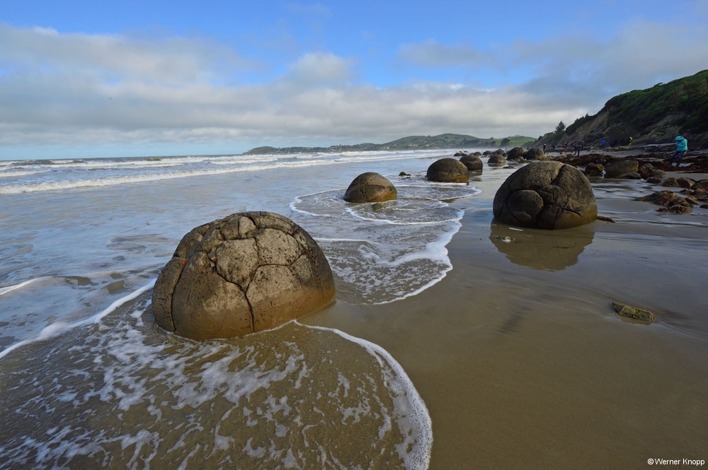 Als wir bei den Moeraki Boulders ankamen, staunten wir nicht schlecht, denn wir sahen zuerst einmal eine Caféteria in kreisrunder Boulder-Form.😄 Für 2$ pro Person durften wir den Fußweg zum Strand benutzen, wo wir die riesigen Kugeln, die sogenannten Boulder, im Sand liegen sahen.
