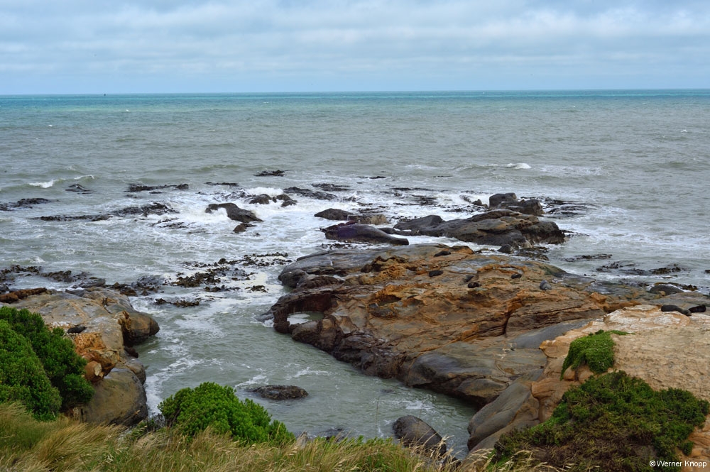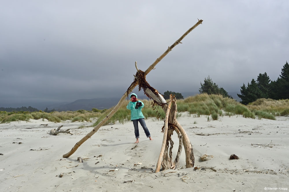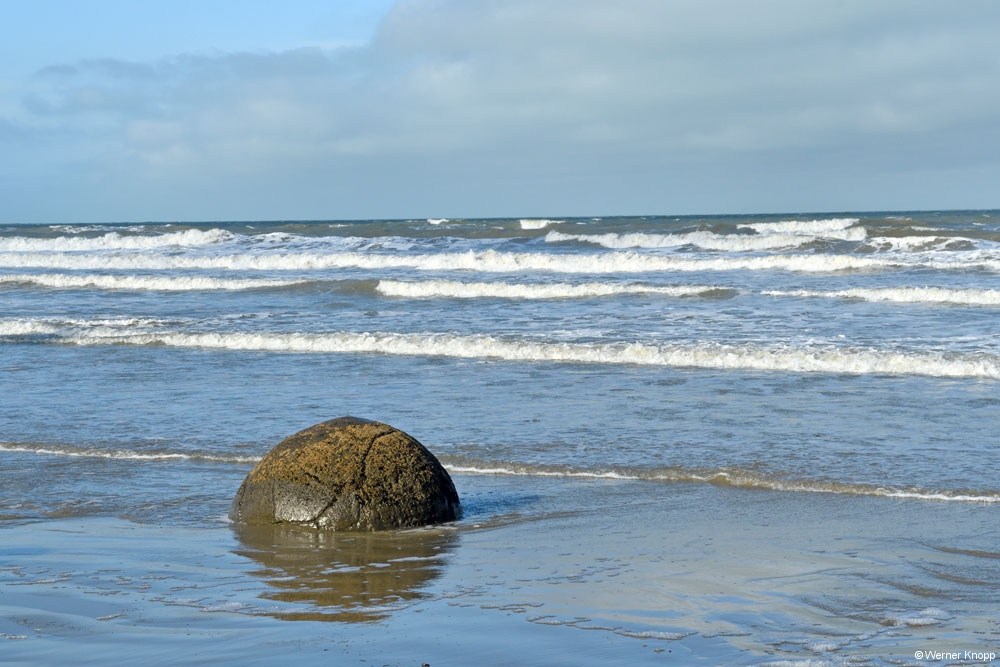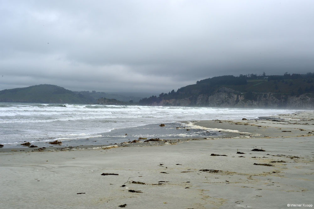 Auf der Fahrt zu unserem nächsten Ziel, den Moeraki Boulders, fuhren wir am 23.11.18 zuerst nach Warrington, um Wasser zu tanken – leider Fehlanzeige! 😳Dafür fanden wir einen herrlichen Strand mit weißem Sand vor und machten einen Strandspaziergang. 👣Es war windig und kalt – Wolken zogen auf. 🌬☁️Bevor es weiterging, stärkten wir uns mit Wrap à la Andy im Wohnmobil. 😇Diese Zwischenmahlzeit aßen wir so oft, dass wir im Januar eine Wrap-Pause einlegten. 😉 Aber heute (29.1.19) schmeckte sie schon wieder.