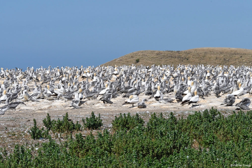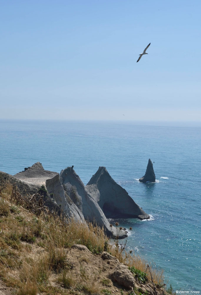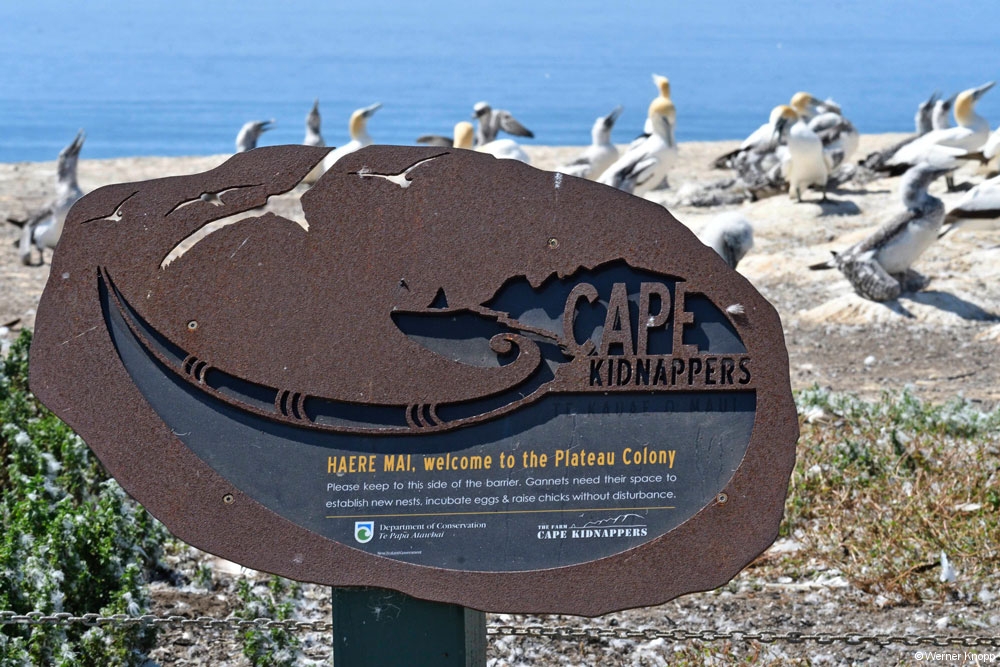 Nun zu den den Gannets (Tölpeln). Hier am Cape Kidnappers befindet sich mit 8000 Paaren die größte von Land zugängliche Tölpelkolonie der Welt. 🐦 Es handelt sich hier um australische Tölpel, die im Frühling zum Brüten hierher fliegen und spätestens im April wieder nach Australien fliegen.