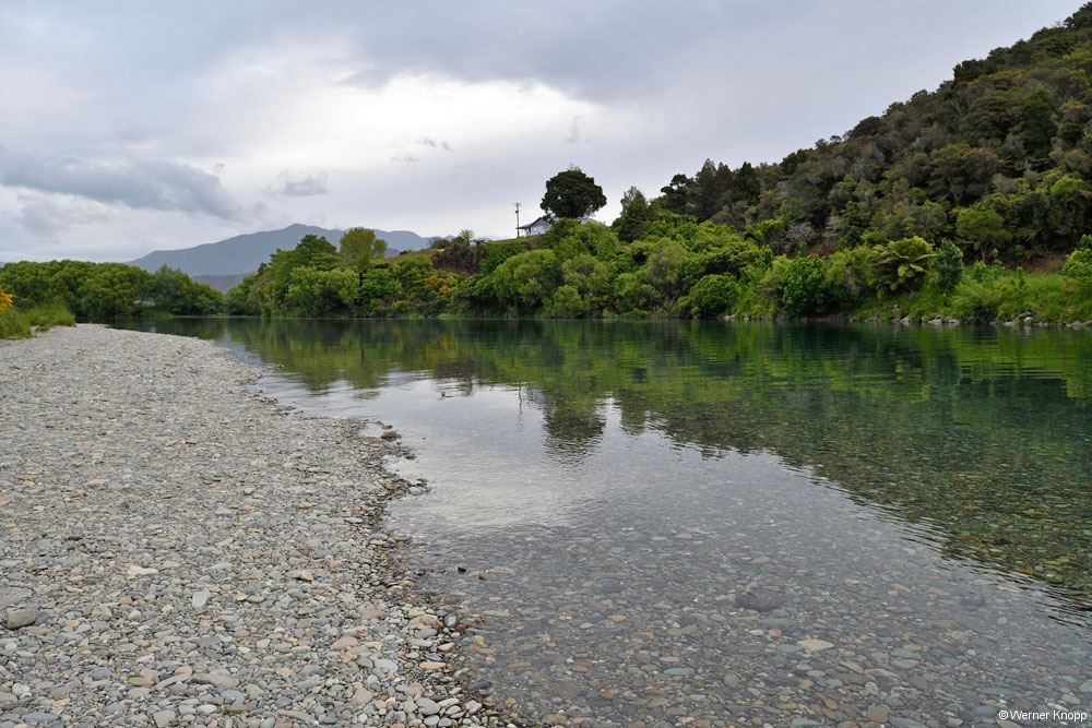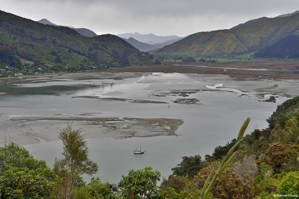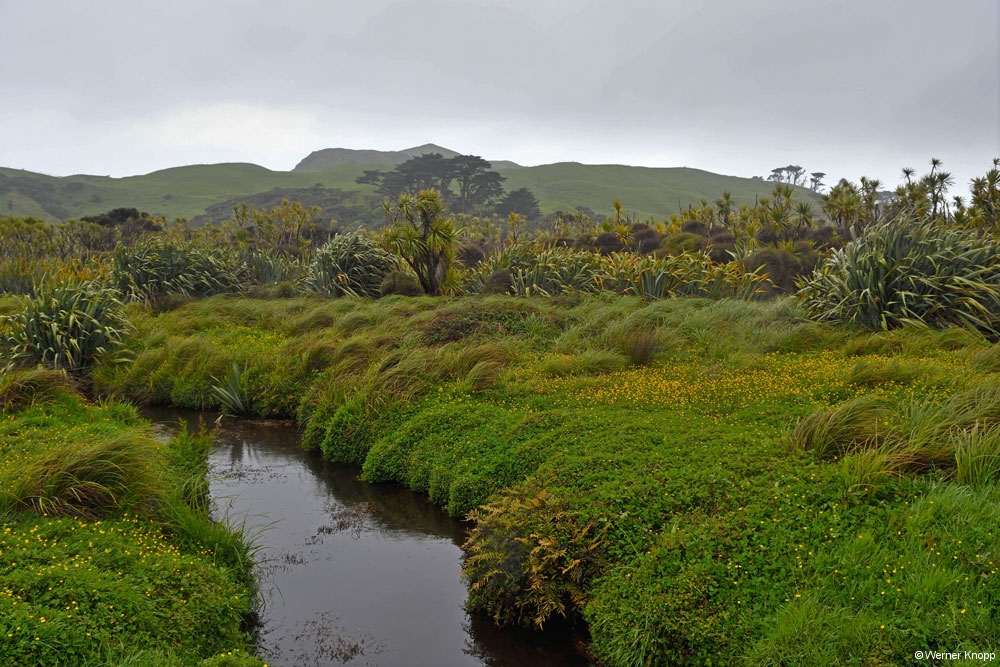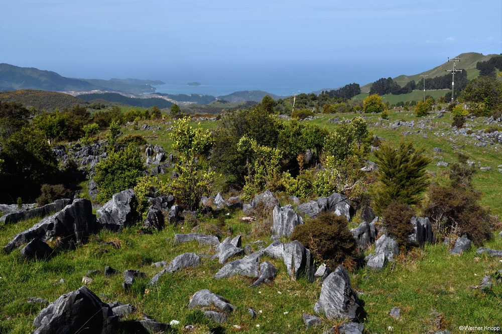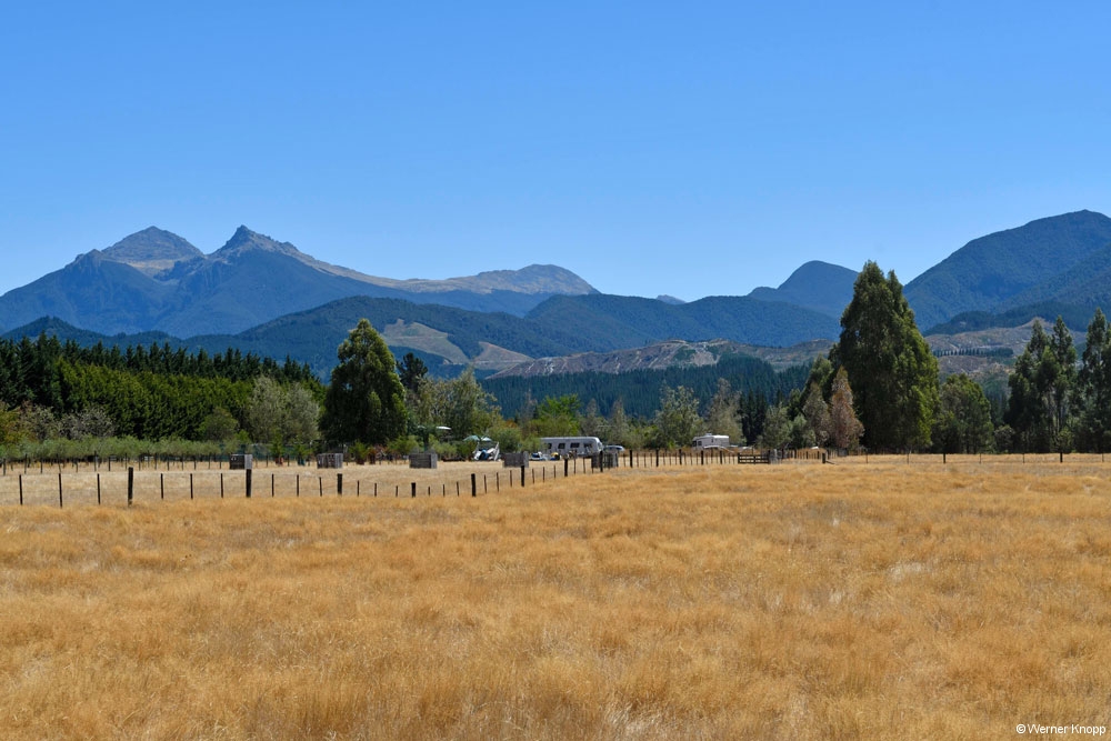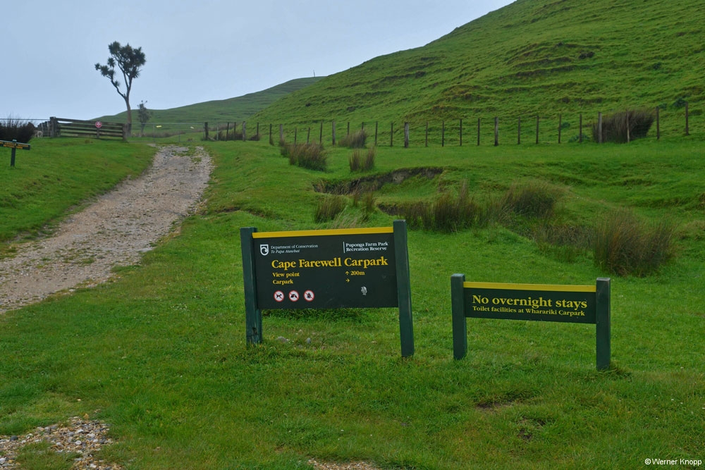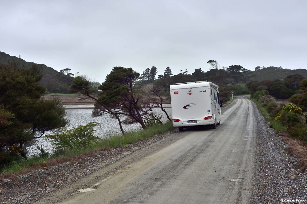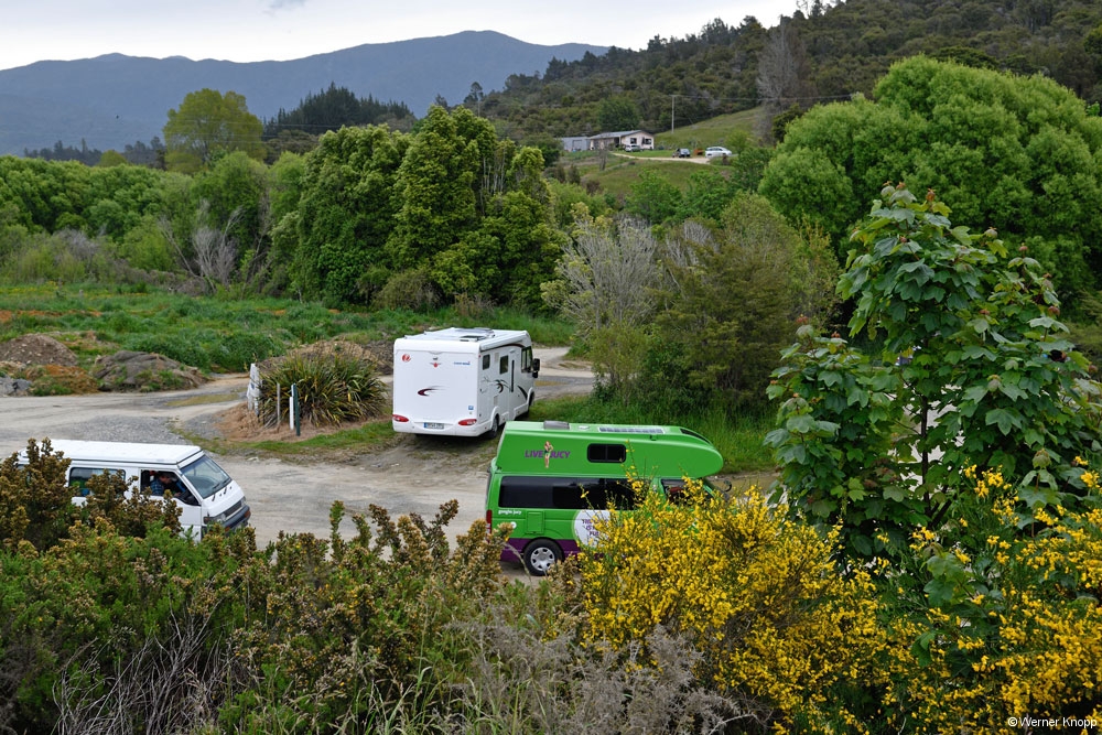 Cape Farewell war unser nächstes Ziel und wieder einmal wurden wir von einer kurvenreichen Fahrt diesmal über die Takaka-Hills überrascht. Haltebuchten gab es nur wenige, so dass Werner hier wieder sehr konzentriert fahren musste. Spitze Felsbrocken schauten aus dem grünen Gras heraus, das sah interessant aus. Auf unserem Freedom-Platz am Fluss angekommen sahen wir lauter große Pfützen, in denen wir uns nicht festfahren wollten. Gut, dass wir noch einen kleinen sicheren Platz fanden! Bisher hatten wir dabei immer Glück. 😌Hier beobachteten wir wieder den Tui, der sich den Nektar aus den Blüten holte, einfach schön! 🐦