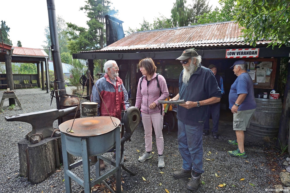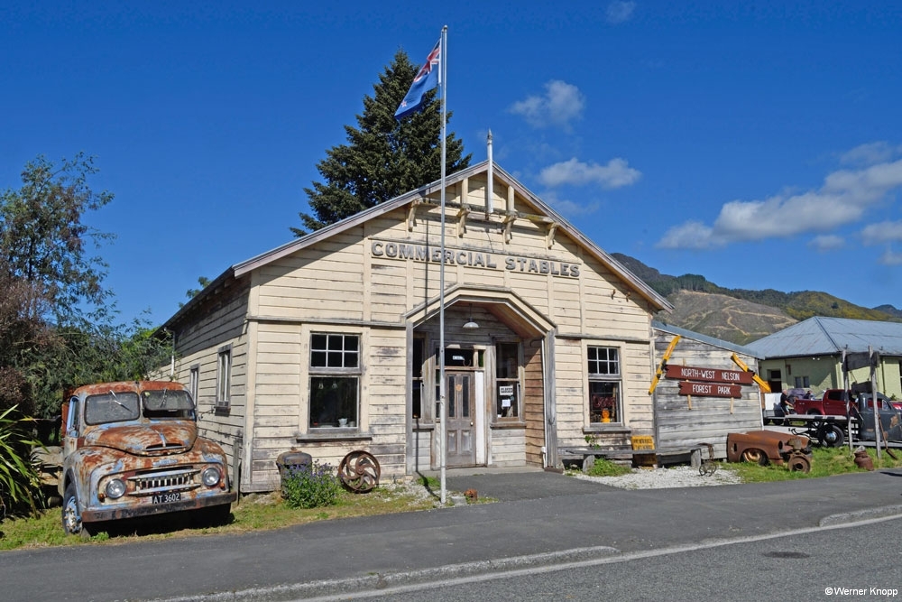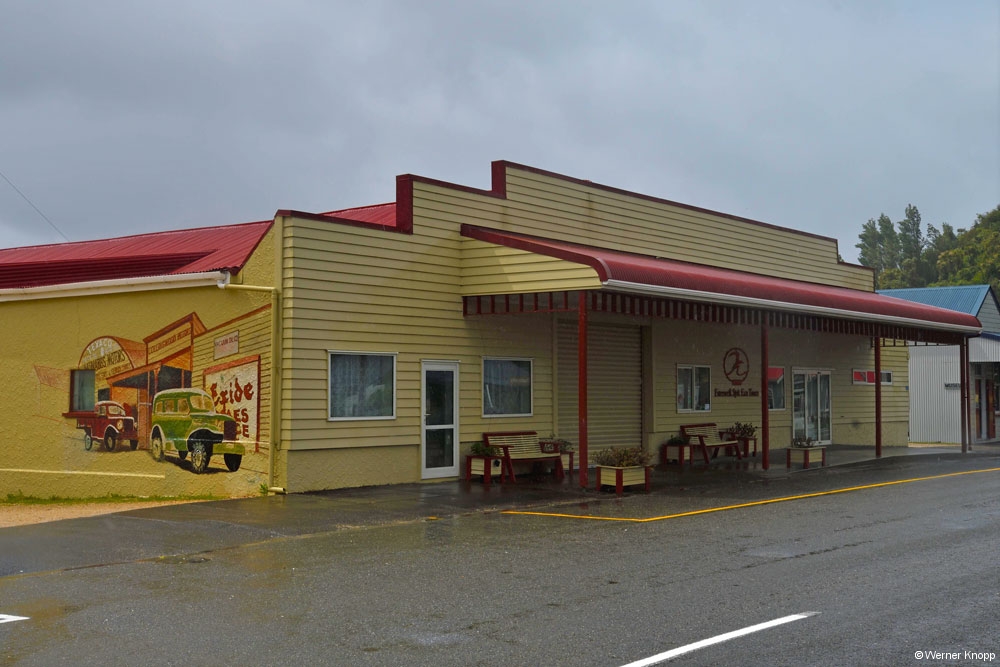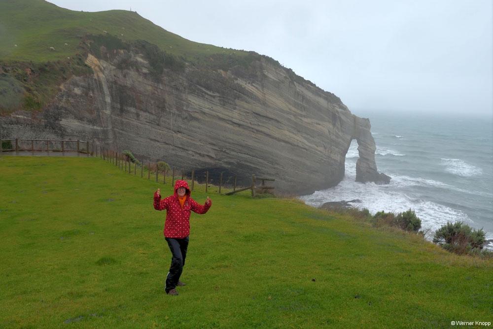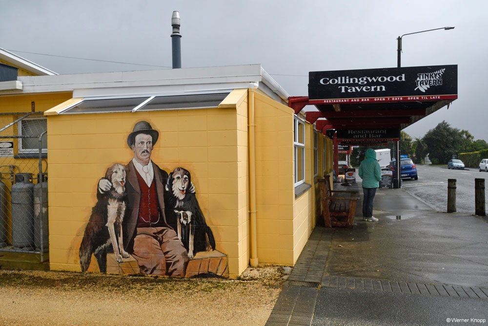Am nächsten Morgen regnete es in Strömen, so dass wir nach dem Frühstück direkt abfuhren, bevor der Boden ganz aufweichte. Zuerst fuhren wir eine moderate Strecke bis Collingwood, das Ende der Zivilisation im Norden.😉 In dieser alten Goldgräbersiedlung stehen einige historische Häuser, die wir uns bei einem Rundgang anschauten. Es regnete und stürmte – das ideale Wetter, um den Reisebericht zu schreiben – aber wir entschieden uns für die Weiterfahrt zum Cape Farewell. 🌊🌬🌨Dort angekommen wanderten wir, geschützt durch unsere Regenkleidung bei Regen und Sturm zu der Stelle, von der aus wir einen Blick auf das Cape werfen konnten. Die Schafe ließen sich von dem Wetter scheinbar nicht stören. Da waren die Pferde schon empfindlicher. 🐑🐑🐎