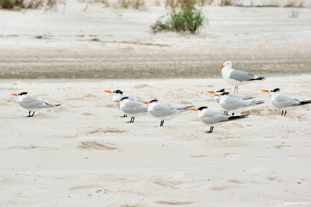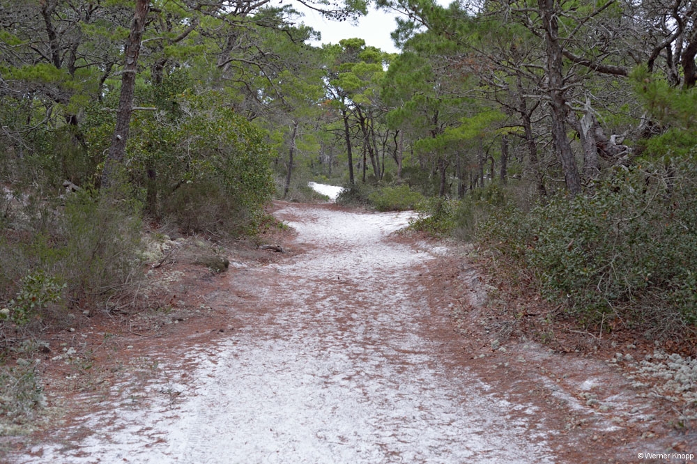 Der State Park ist in verschiedene Bereiche eingeteilt, Tagesbesucher, Campingbereich, Hafen etc.. Am Ende der Insel liegt das Gebiet „Wilderness Preserve“, für das man sich eine Erlaubnis holen musste. Hier liefen wir meilenweit durch unberührte Natur und trafen kaum jemanden. Einfach herrlich! Frische Spuren wiesen auf Wild hin; ein Wanderer zeigte uns stolz ein Foto, auf dem ein Hirsch zu sehen war. 🙂 Die Dünen und der Strand waren in diesem Bereich der Insel einfach umwerfend! Bei den niedrigen Temperaturen gingen wir durch den schneeweißen Sand wie durch Schnee! Da es uns hier so gut gefiel, fuhren wir am nächsten Tag mit unseren Rädern wieder an diese Stelle. Für kurze Zeit kam die Sonne zwischen den Wolken heraus und schon hatte Werner einige gute Bilder im Kasten. 😉