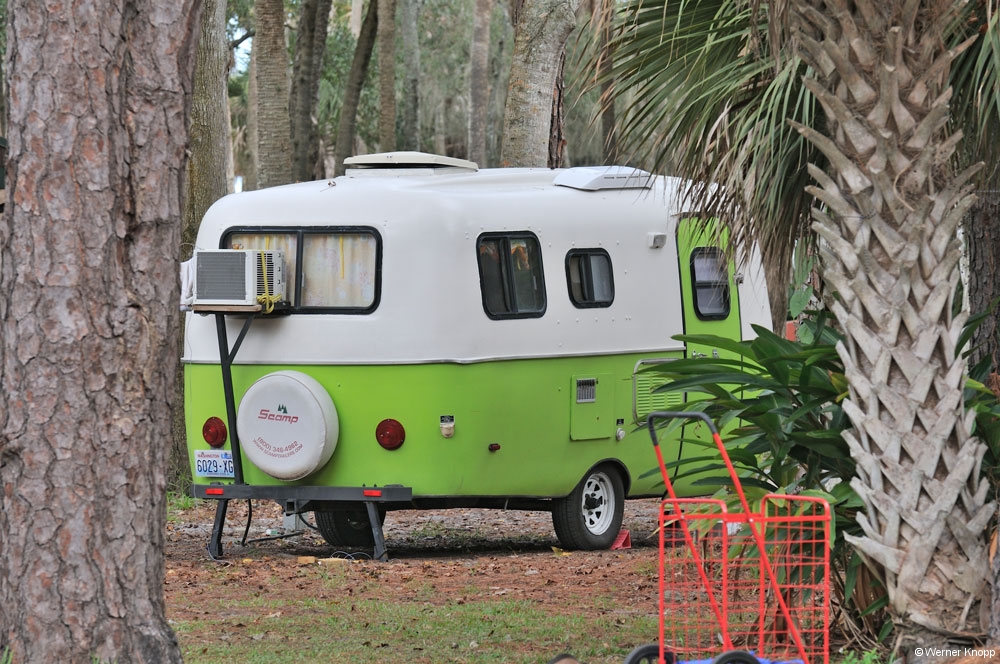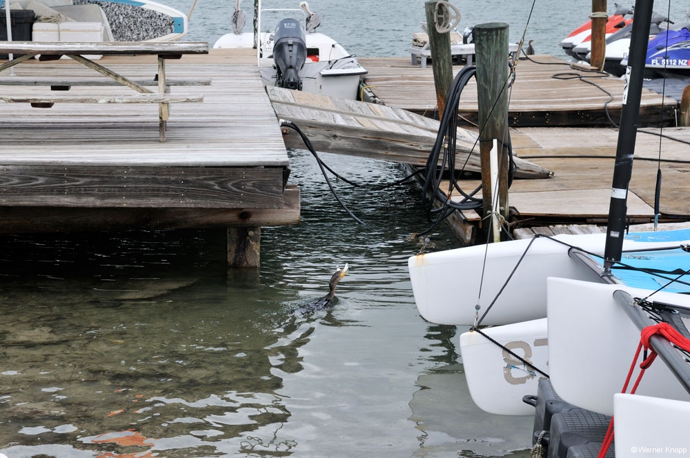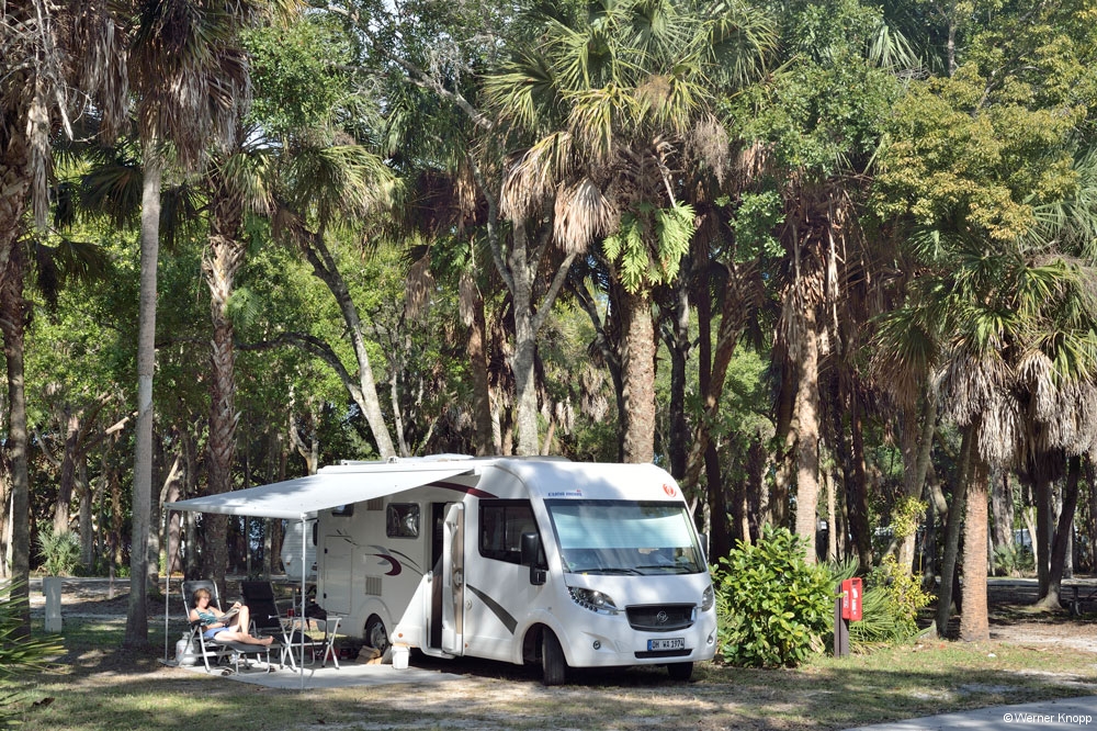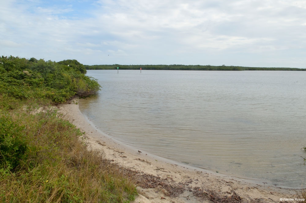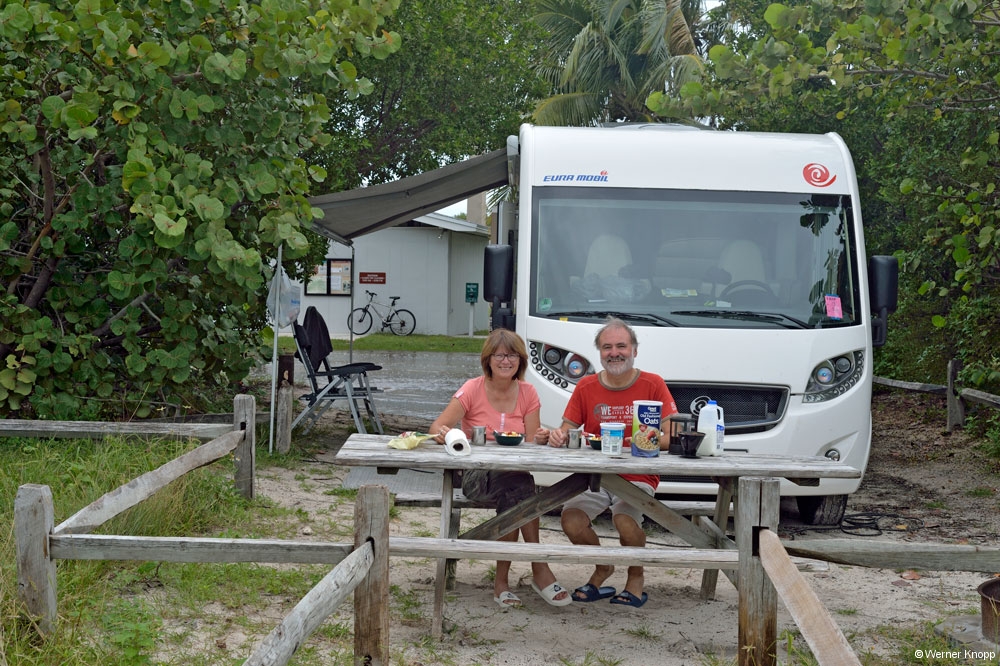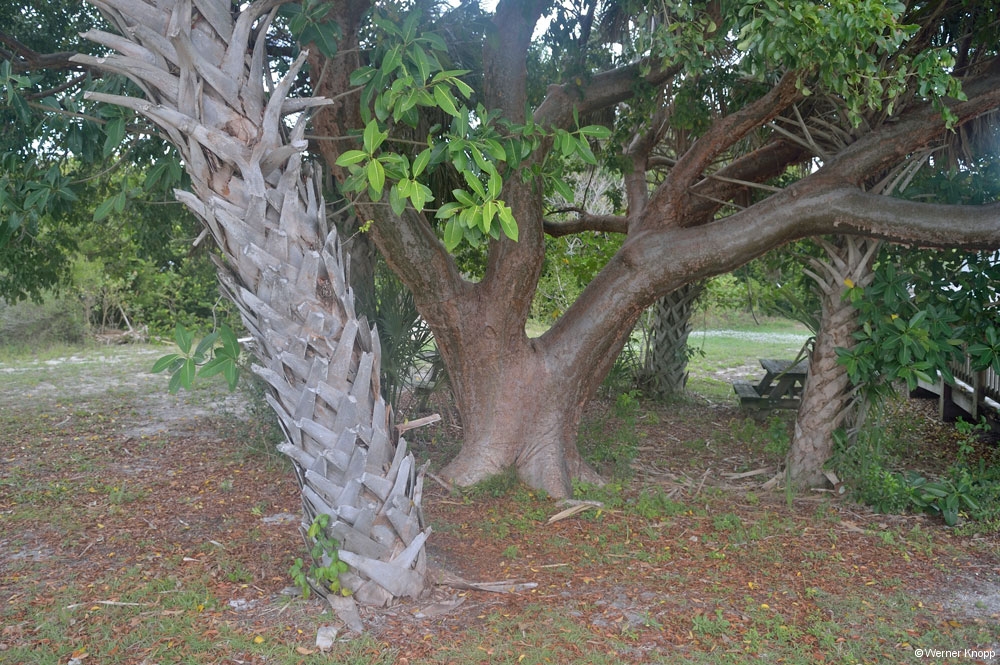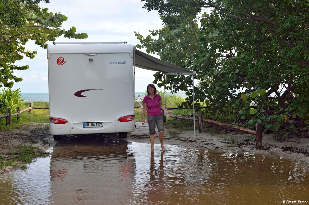 Wie in allen anderen State Parks gab es auch hier einen „Trail“, den wir am nächsten Tag gingen. Auch dieser stand teilweise noch unter Wasser. Hier sahen wir viele große Fische im flachen Wasser schwimmen. Ein Ukrainer aus Indiana erklärte uns, dass man diesen Fisch, den Tarpon, an der Flosse erkennen kann, die aus dem Wasser herausragt. Auf dem Trail lernten wir auch „Poison Wood“ kennen, welches starke Hautverletzungen verursacht. Selbst wenn Regentropfen von diesem Baum fallen, verletzen sie die Haut! Der viele Müll, der unter den Bäumen lag, stammte nicht von den Spaziergängern, sondern war angeschwemmt worden. Die stark befahrene Wasserstraße, die an Südflorida vorbeiführt, hinterlässt ihre Spuren. Am nächsten Morgen zeigte sich unser Platz bei Sonnenschein und blauem Himmel von seiner schönsten Seite. Auch die „Wasserstraße“ war schon ein wenig verdunstet, jedoch kamen wir noch nicht trockenen Fußes zur Dusche. 😉