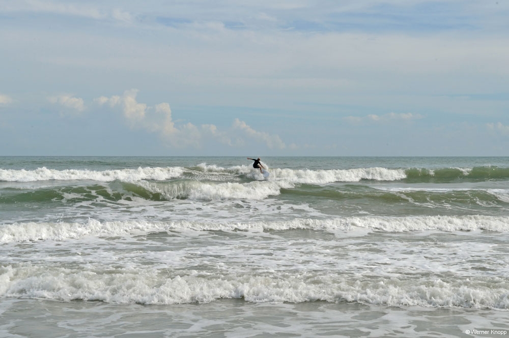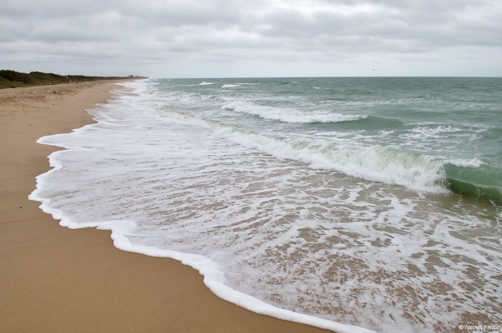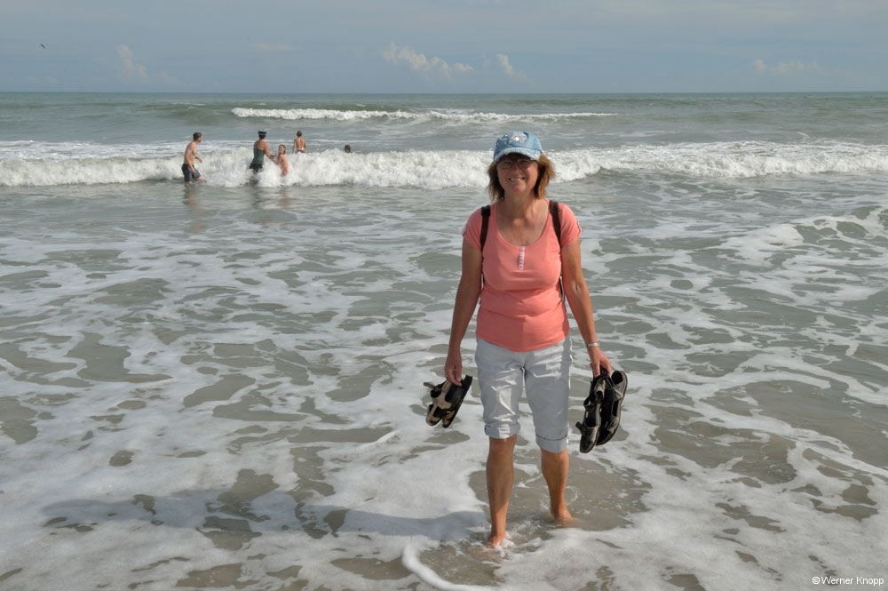 Im Park angekommen erfahren wir, dass der Platz zum Teil unter Wasser steht, das nicht abläuft… Wir hatten den Platz am Vortrag gebucht, also schauten wir uns das Ganze erst einmal an. Mit Schwung fuhr Werner die Wasserstraße entlang. 😉 Siehe da: Auf unserem Platz stand auch Wasser, aber nur zum Teil, puh! Wir nahmen´s gelassen, die Hauptsache der Stromumwandler steht im Trockenen! 😉 Unser Wohnmobil stand mit Blick auf das Meer, wir wanderten durch das warme Wasser und stellten unsere Stühle an den Strand und lasen. Die Sonne kam sogar ein wenig heraus, so gefiel es auch mir 😉 …