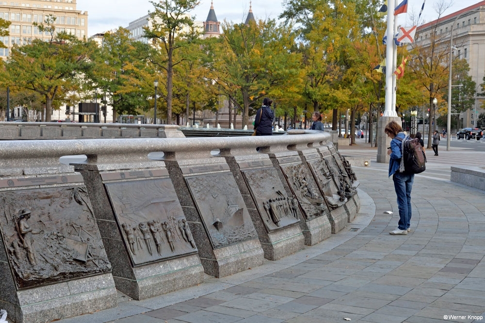 Das nächste sehr viel Raum einnehmende Denkmal ist das „National World War II Memorial“. (2004) Was soll mit diesem monumentalen Denkmal ausgedrückt werden? An diesem Denkmal wurde auch in den USA Kritik geübt… Ganz anders als die 52 Säulen wirkte auf uns „The Freedom Wall“. Jeder Stern auf dieser Wand steht für 100 Menschen, die im Krieg starben oder vermisst wurden.